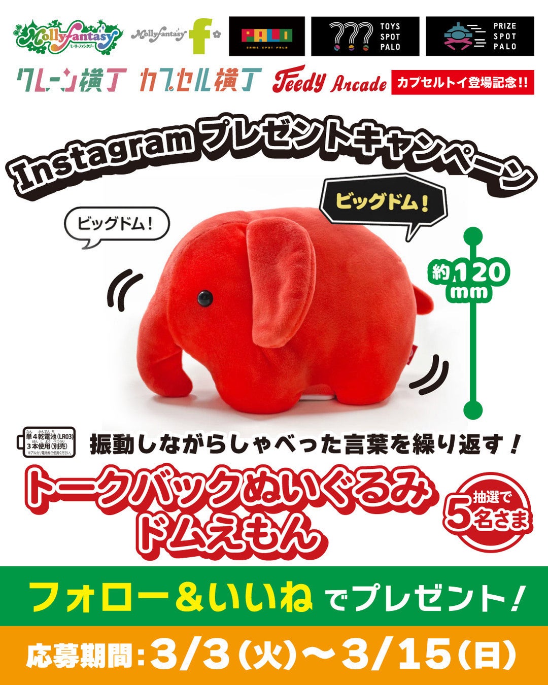 また、限定カプセルトイ用商品の展開を記念し、モーリーファンタジー公式X・Instagram で「トークバックぬいぐるみ ドムえもん」が当たるプレゼントキャンペーンを開催いたします。