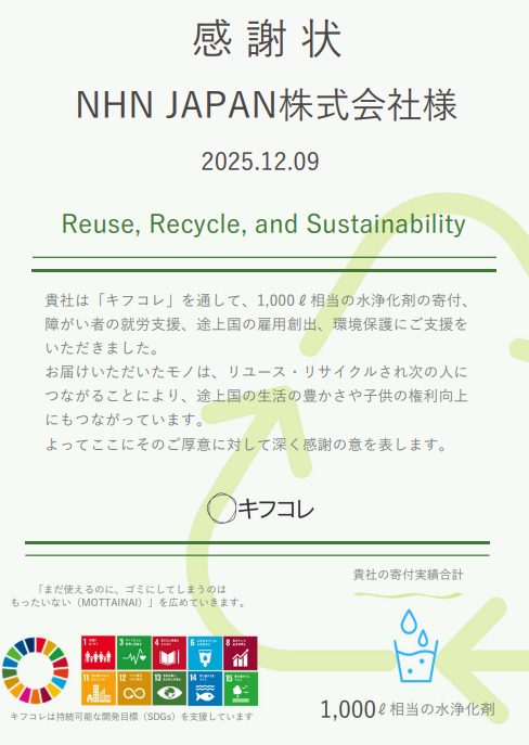 また、販売に至らなかった品物を寄付した「キフコレ」からも感謝状を拝受いたしました。