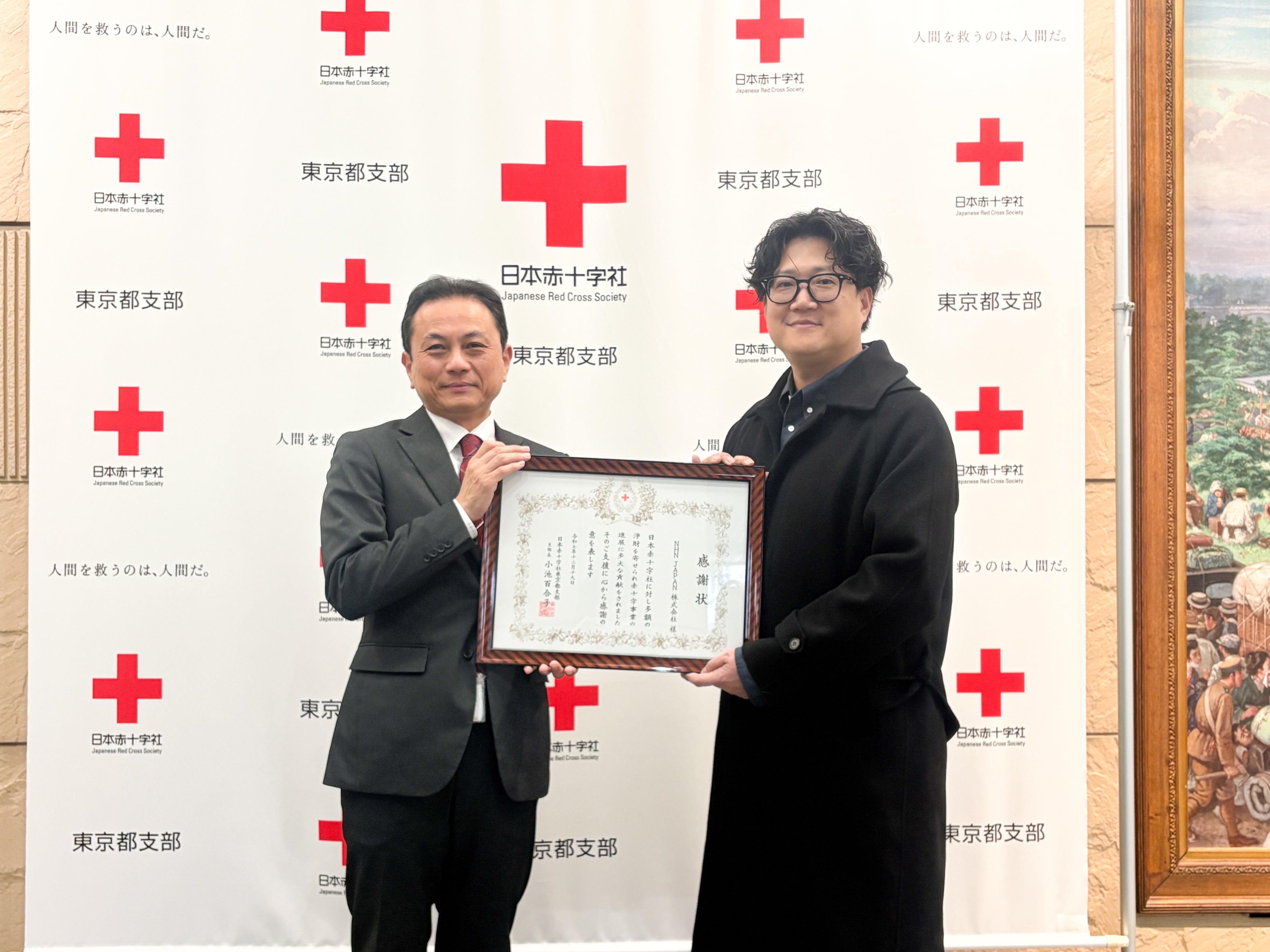 本イベントを通じた寄付に対し、NHN日本法人グループを代表してNHN JAPAN株式会社 CHRO金建諧(写真右)が日本赤十字社より感謝状を拝受いたしました。本寄付金は、人道支援の現場で役立てられ、同社の活動の一助となります。