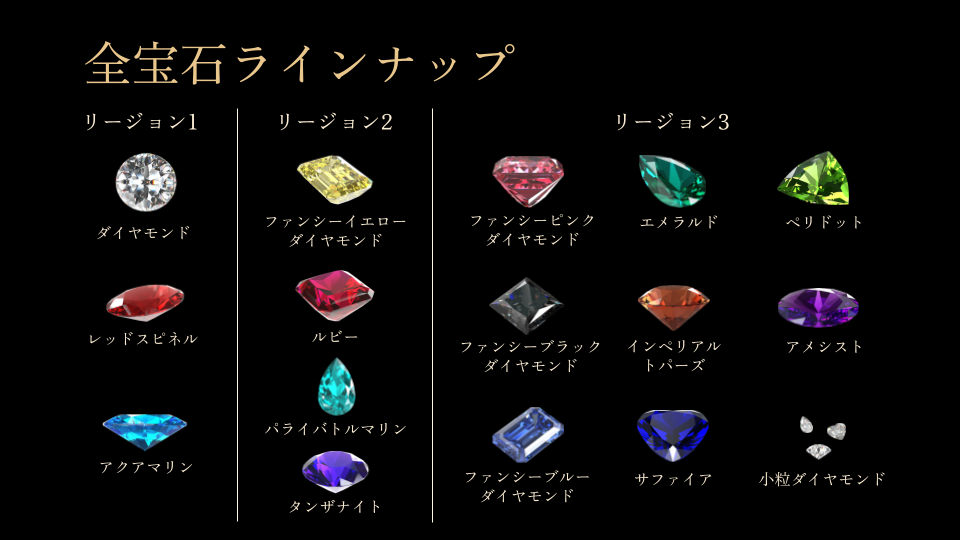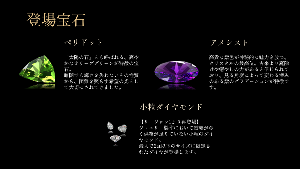 リージョン3では希少性の高いカラー宝石など、全9種類の宝石が登場します。