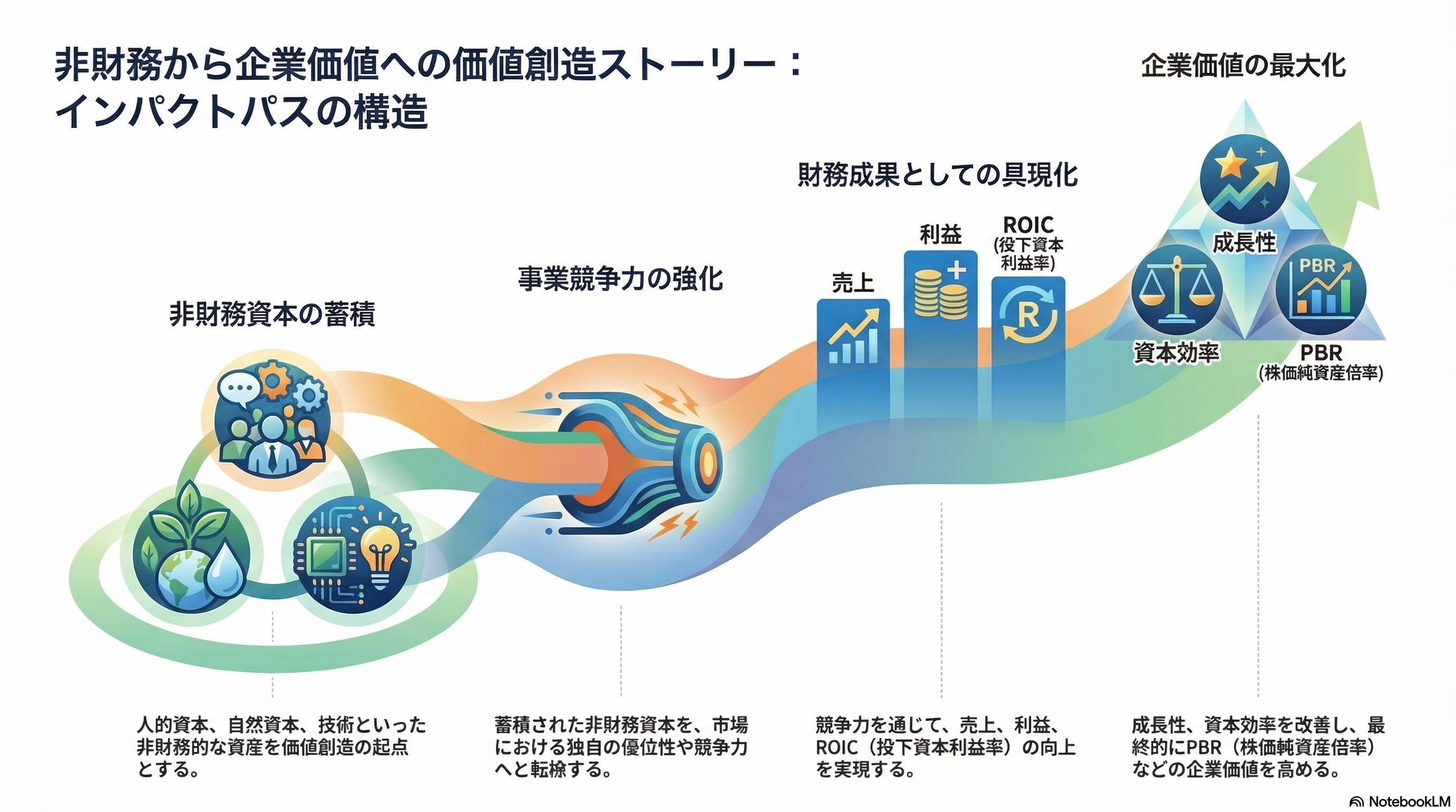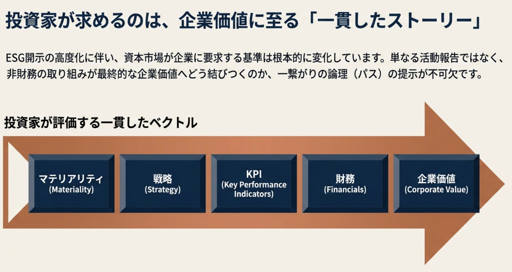 統合報告書、TCFD、TNFDなどESG開示の高度化に伴い、企業は単なる活動の説明ではなく、ESGが企業価値にどのようにつながるのかを示すことが求められています。
