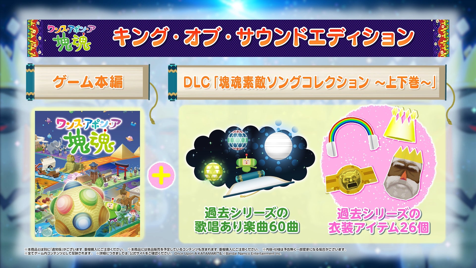 シリーズ過去作の歌唱あり楽曲60曲や衣装アイテム26個が入手できる有料追加DLC「塊魂素敵ソングコレクション~上巻~」 「塊魂素敵ソングコレクション~下巻~」を同梱する「キング・オブ・サウンドエディション」も発売中!