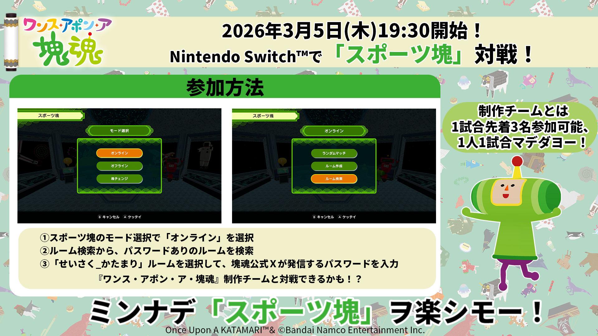 本日3月5日(木) 19:30からみんなで対戦! Nintendo Switch™版『ワンス・アポン・ア・塊魂』で 制作チームと「スポーツ塊」をプレイしよう!