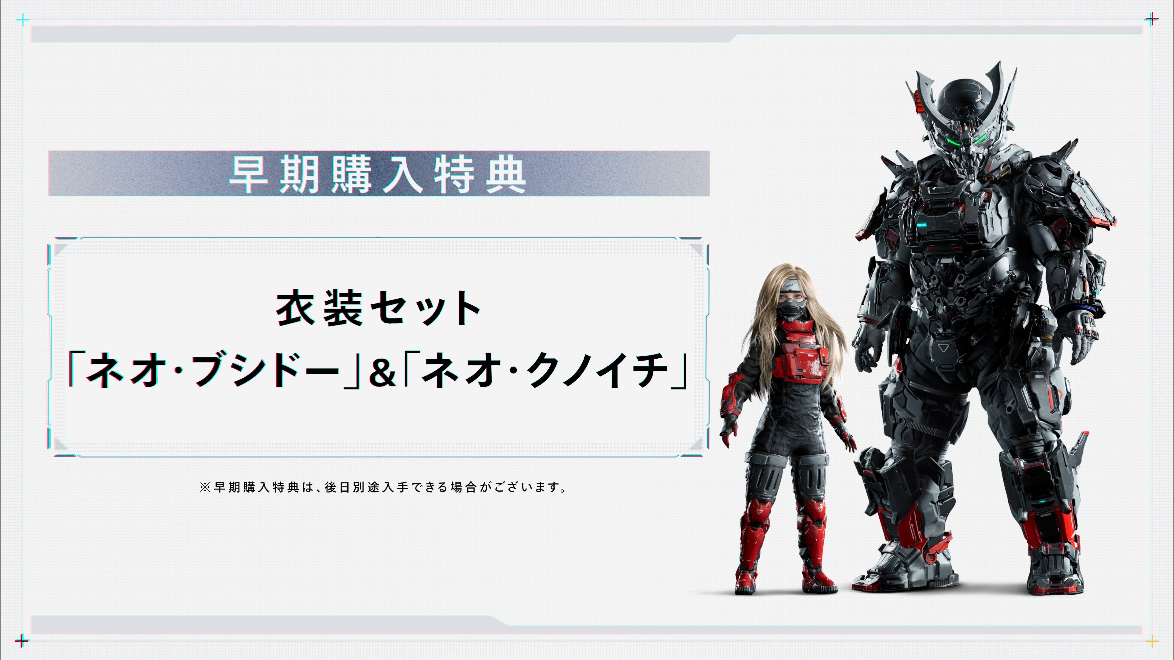 『プラグマタ』のパッケージ版、ダウンロード版ともに早期購入特典として勇猛果敢な戦国時代の武士の衣装を纏ったヒューの衣装「ネオ・ブシドー」と、可憐に暗躍する忍者をテーマにしたディアナの衣装「ネオ・クノイチ」をプレゼント! ぜひ、ご予約して手に入れてください。