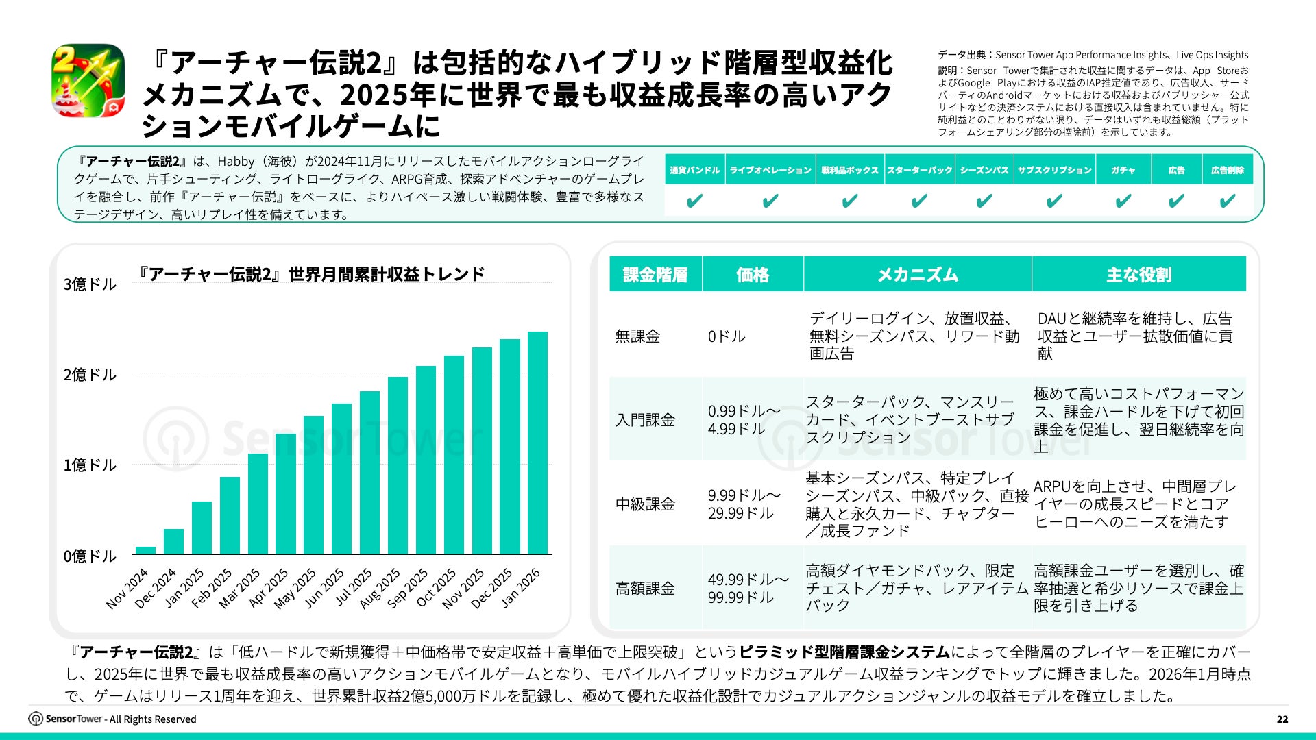 『アーチャー伝説2』は「低ハードルでの新規獲得+中価格帯での安定収益+高単価での収益最大化」というピラミッド型階層型課金体系によって、全レベルのプレイヤーを正確にカバーし、2025年世界で最も収益成長が高いアクションゲームとなり、ハイブリッドカジュアルゲーム収益ランキングでトップを獲得しました。同作は2026年1月時点でリリース1周年を迎えており、世界累計収益2億5,000万ドルに達し、極限の商業化設計によってカジュアルアクションジャンルの収益モデルを確立しました。
