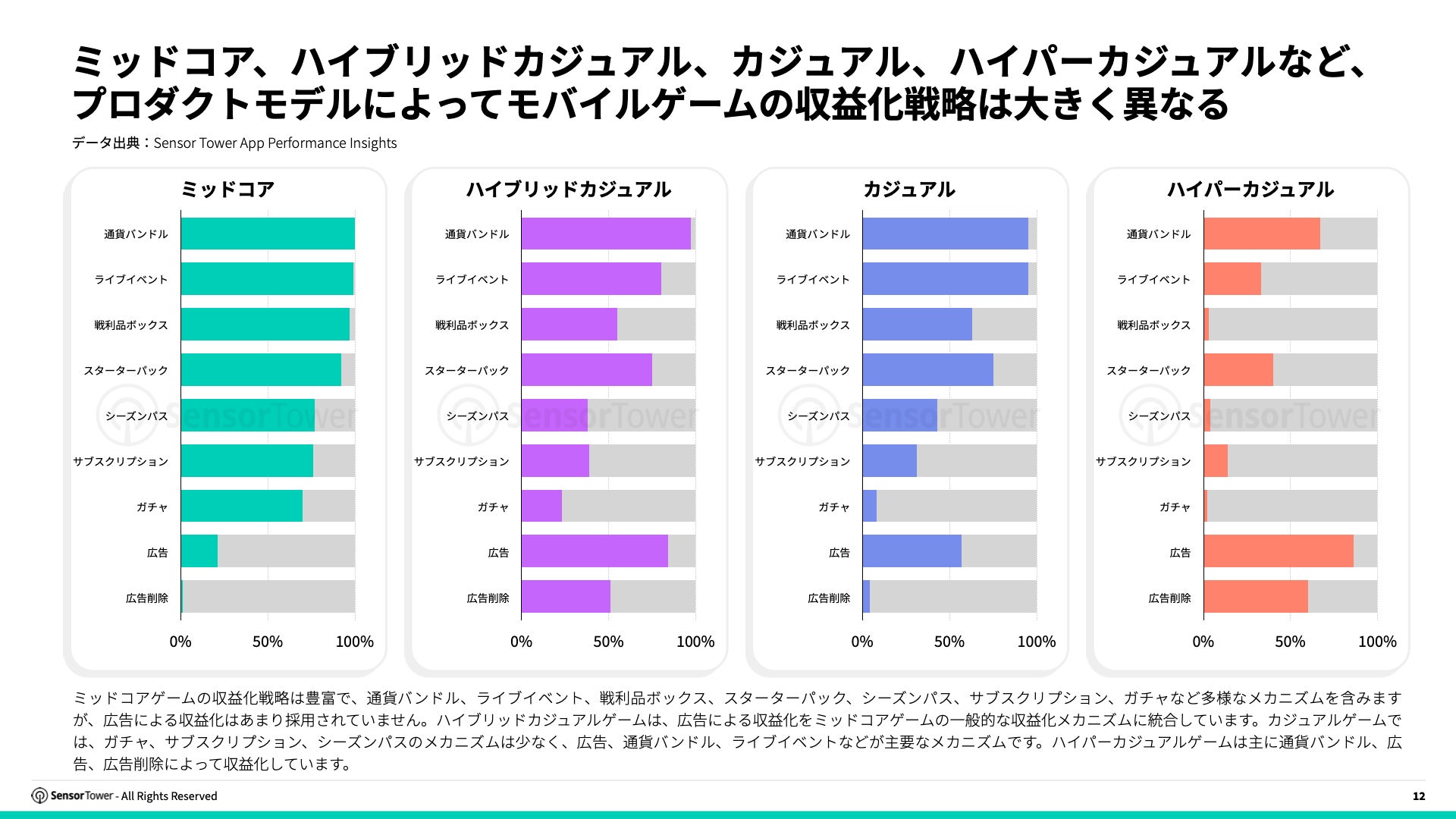 トップゲームの80%以上が5~7種類の収益化戦略の組合せで収益最大化を実現