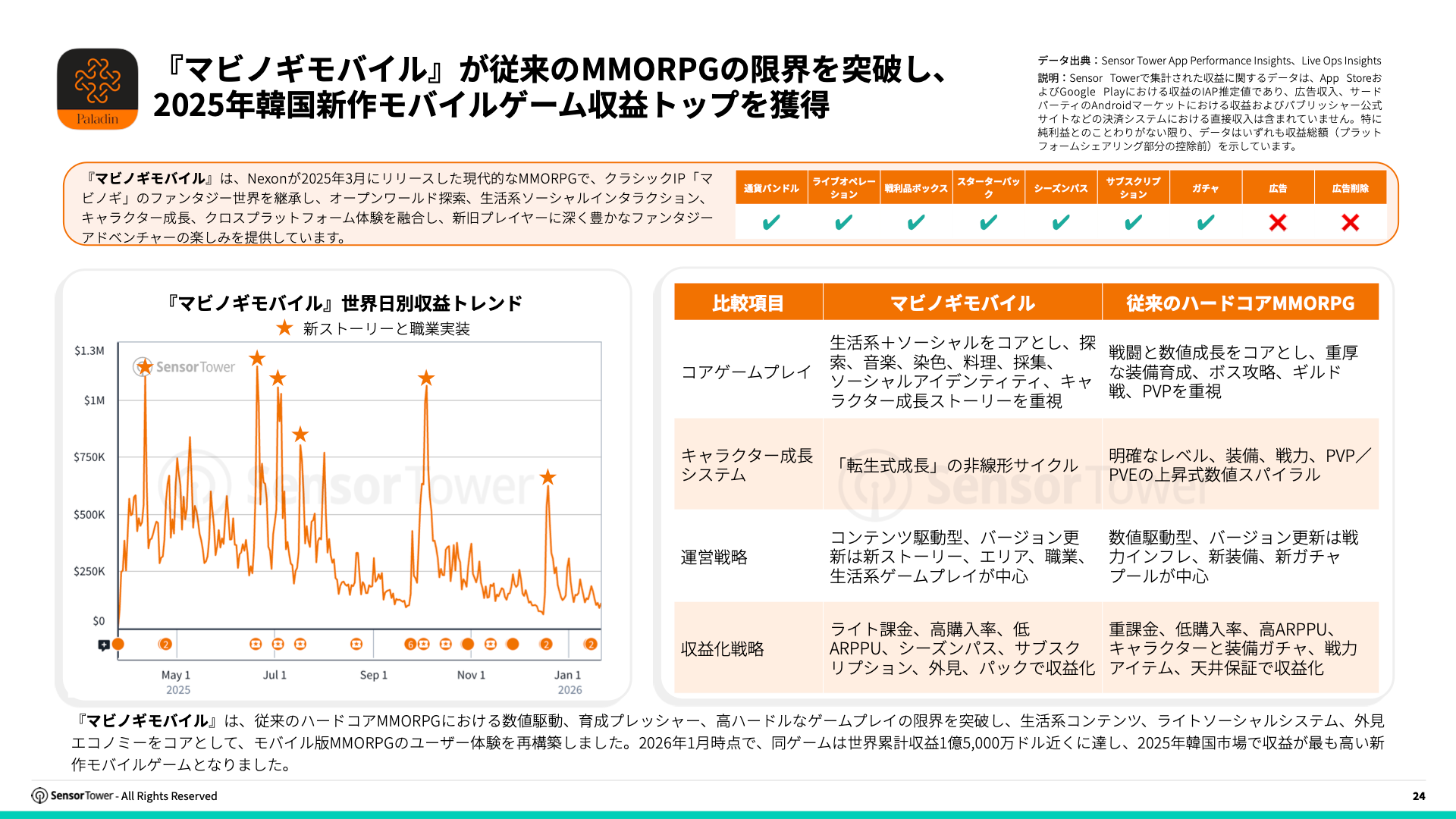 『マビノギモバイル』は、従来のハードコアMMORPGにおける数値駆動、育成プレッシャー、高ハードルなゲームプレイの限界を突破し、生活系コンテンツ、ライトソーシャルシステム、外見エコノミーをコアとして、モバイル版MMORPGのユーザー体験を再構築しました。2026年1月時点で、同ゲームは世界累計収益1億5,000万ドルに達し、2025年韓国市場で収益が最も高い新作モバイルゲームとなりました。
