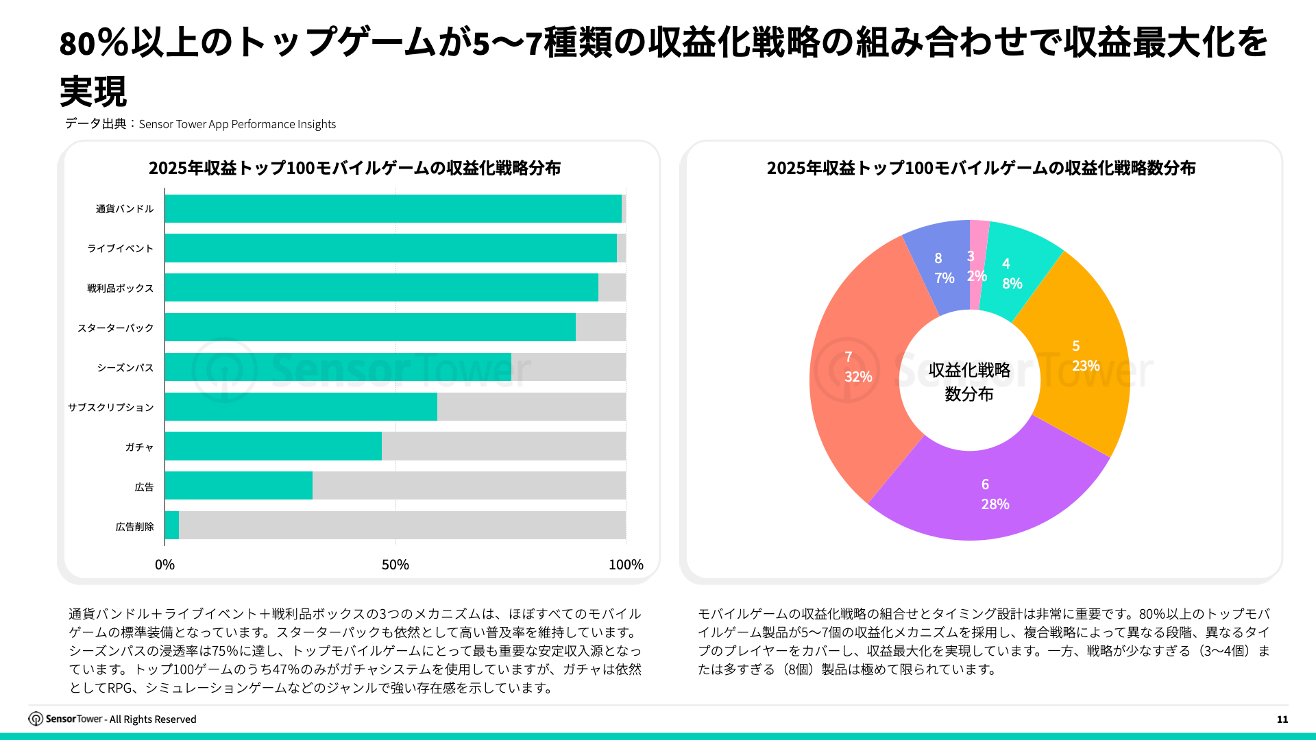 トップゲームの80%以上が5~7種類の収益化戦略の組合せで収益最大化を実現