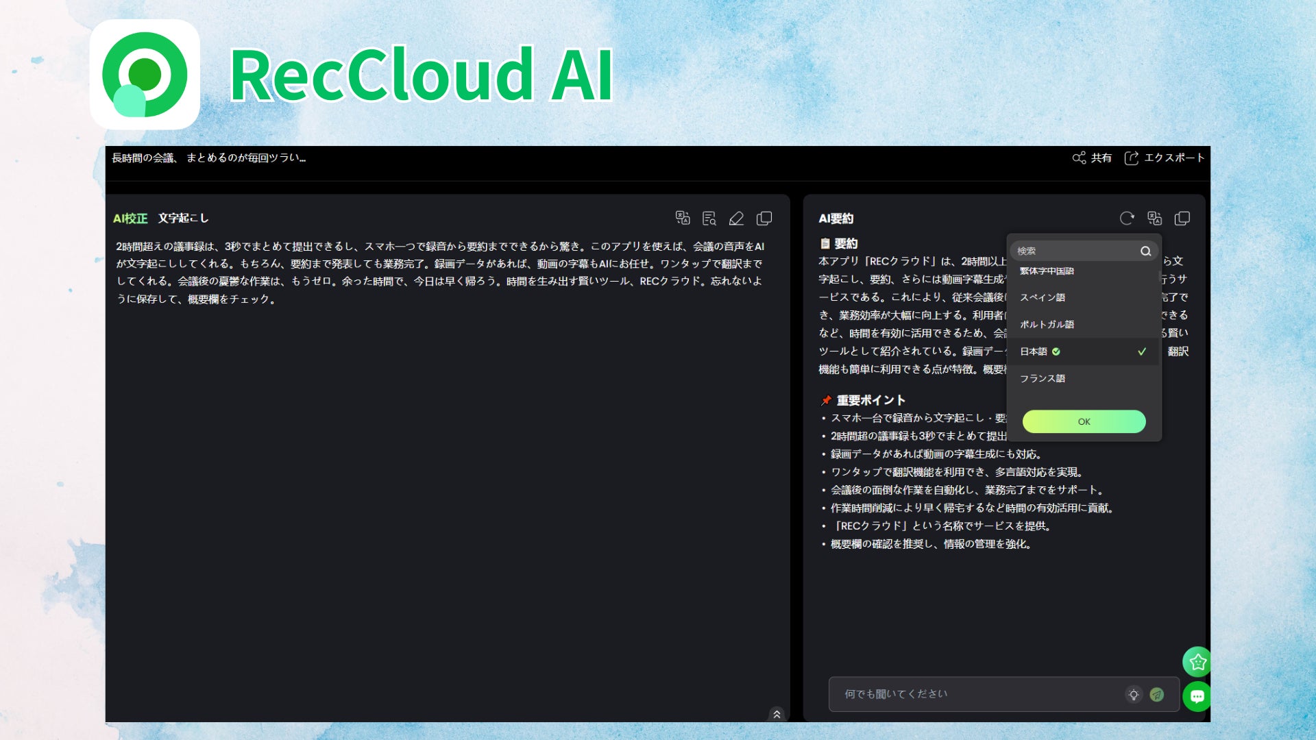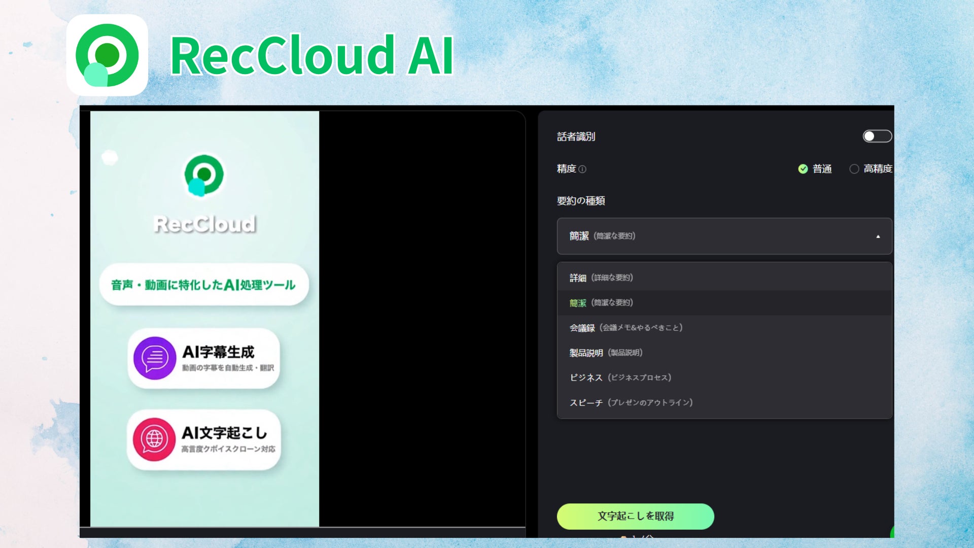 RecCloudは、音声・動画ファイルの文字起こし、字幕生成、翻訳、動画要約、音声抽出など、動画関連作業をAIで効率化するクラウドプラットフォームです。
