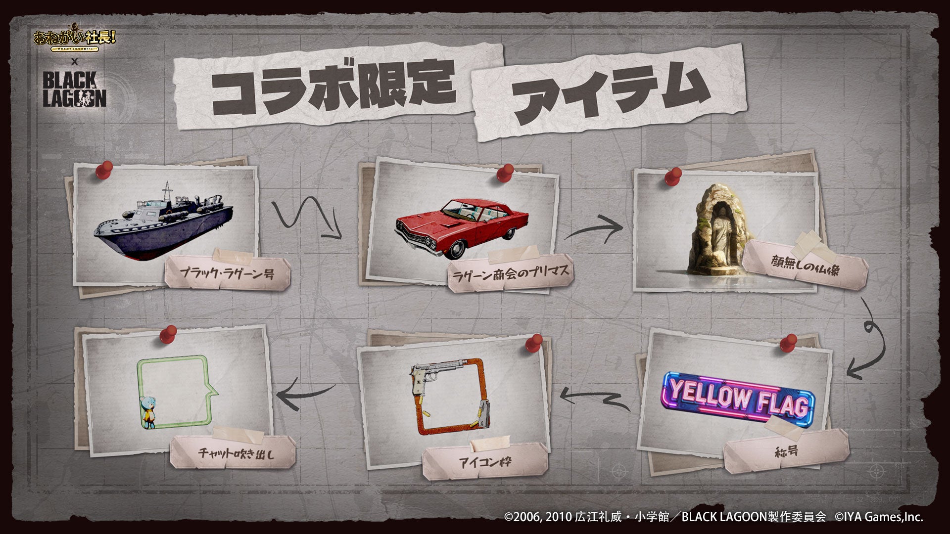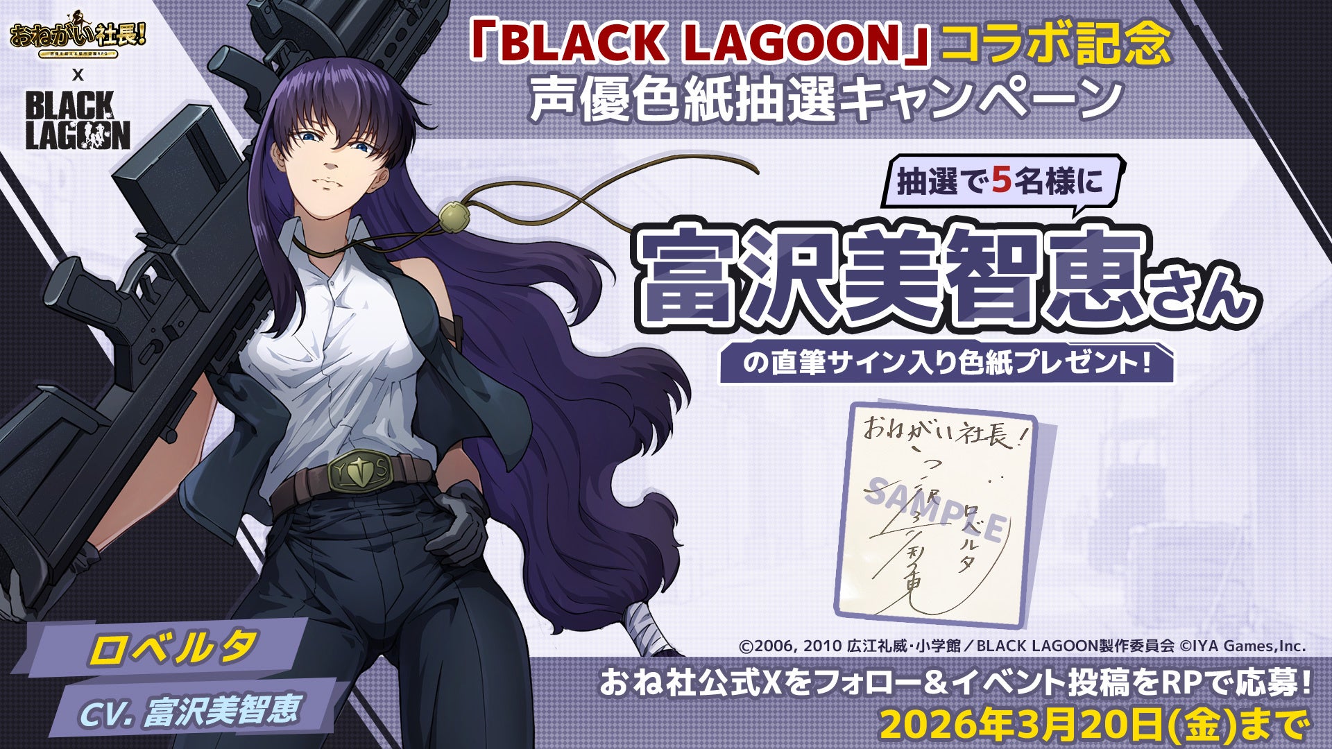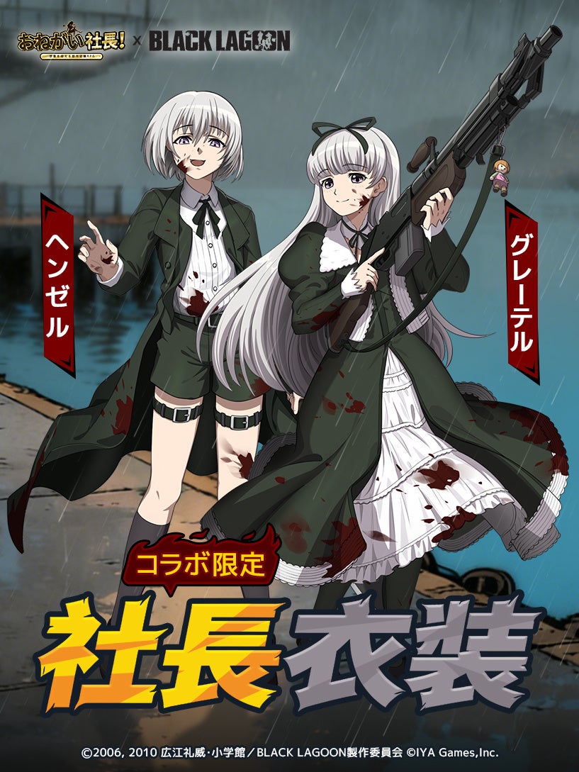 IYAGAMESは、スマホ向け人気会社経営シミュレーションゲーム『おねがい社長!』において、TVアニメ『BLACK LAGOON』(ブラック・ラグーン)とのコラボを2026 年 3 月 6 日 (金)より開催します。