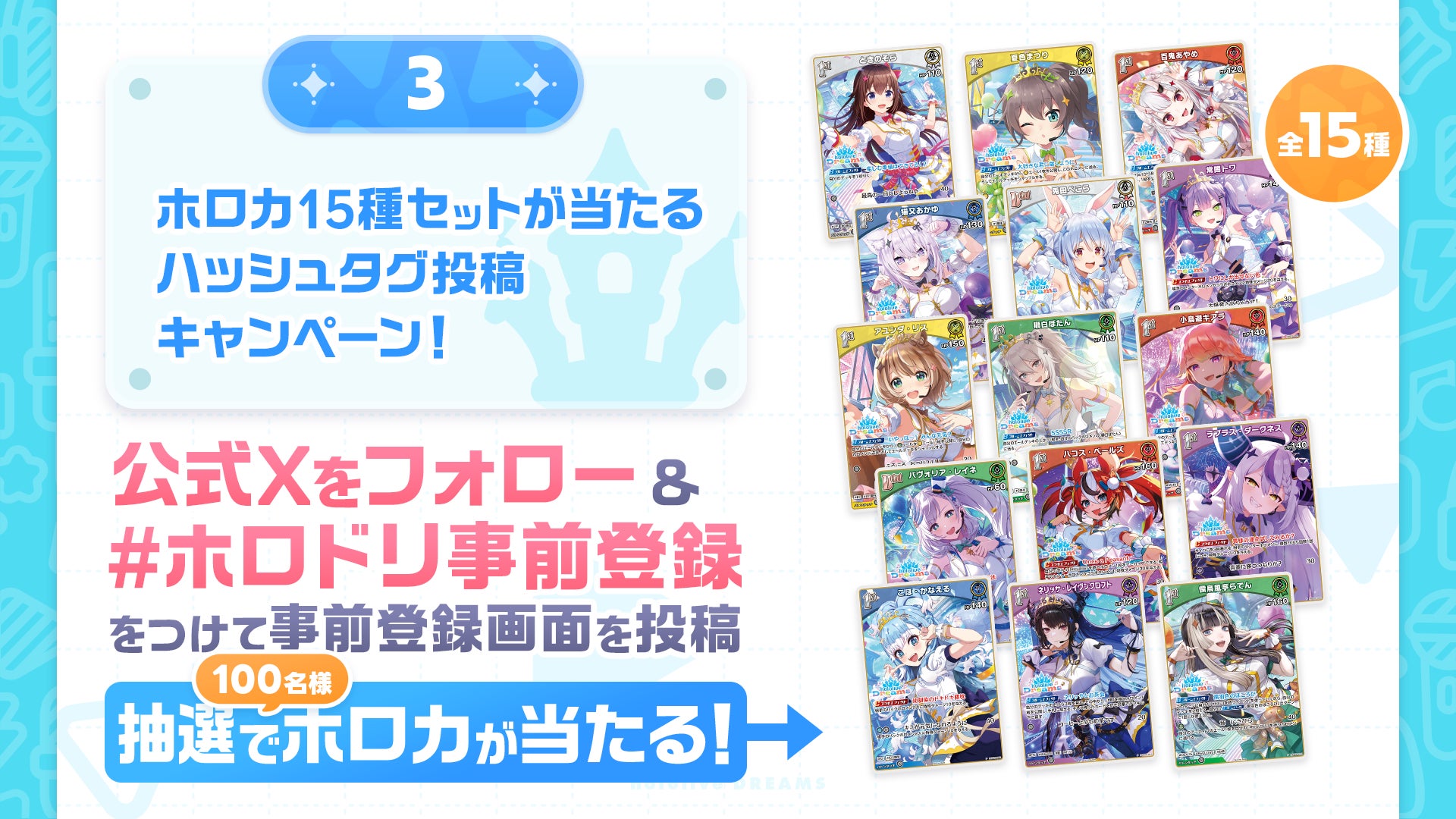 事前登録して、公式Xで#ホロドリ事前登録で投稿すると抽選でホロカ15種セットが当たるキャンペーンを実施いたします。