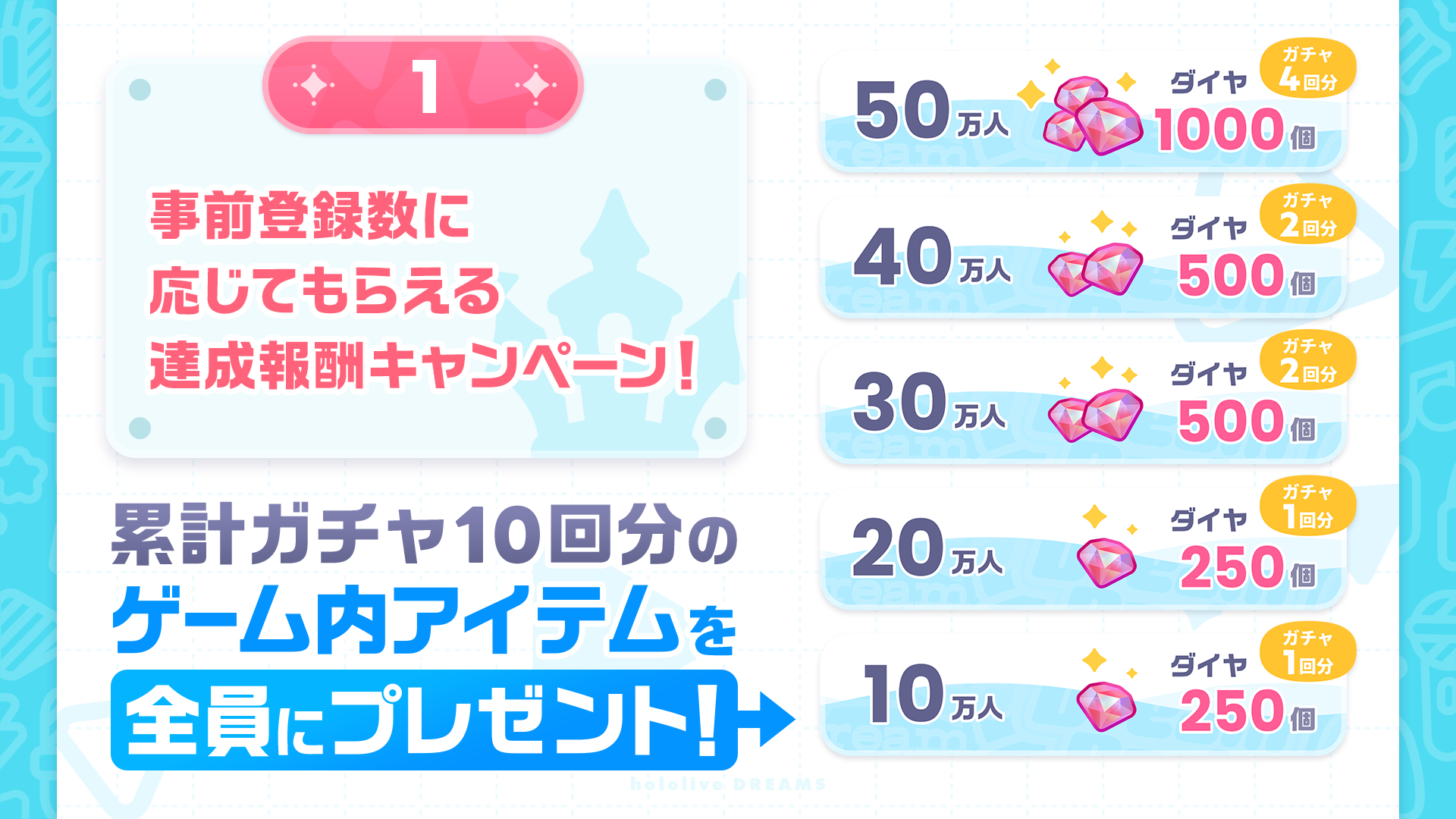 事前登録数に応じて、累計ガチャ10回分のゲーム内アイテムを全員にプレゼントいたします。