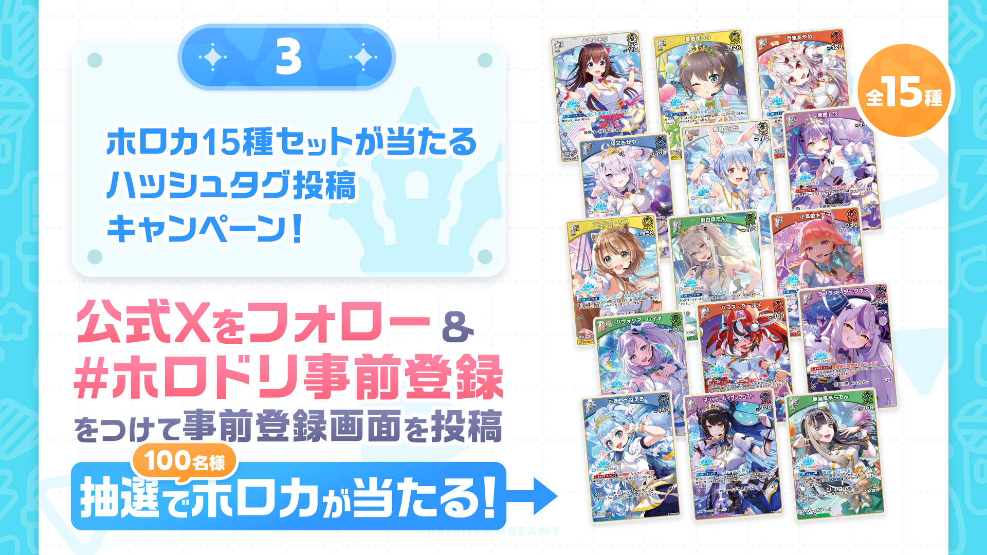 事前登録して、公式Xで#ホロドリ事前登録で投稿すると抽選でホロカ15種セットが当たるキャンペーンを実施いたします。