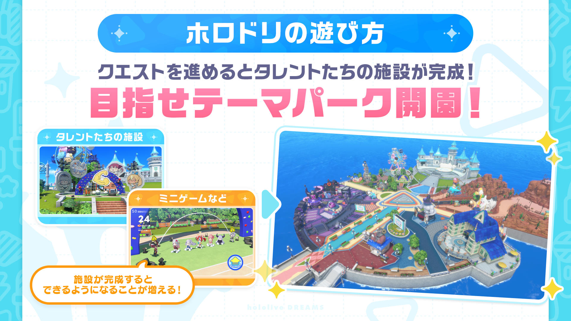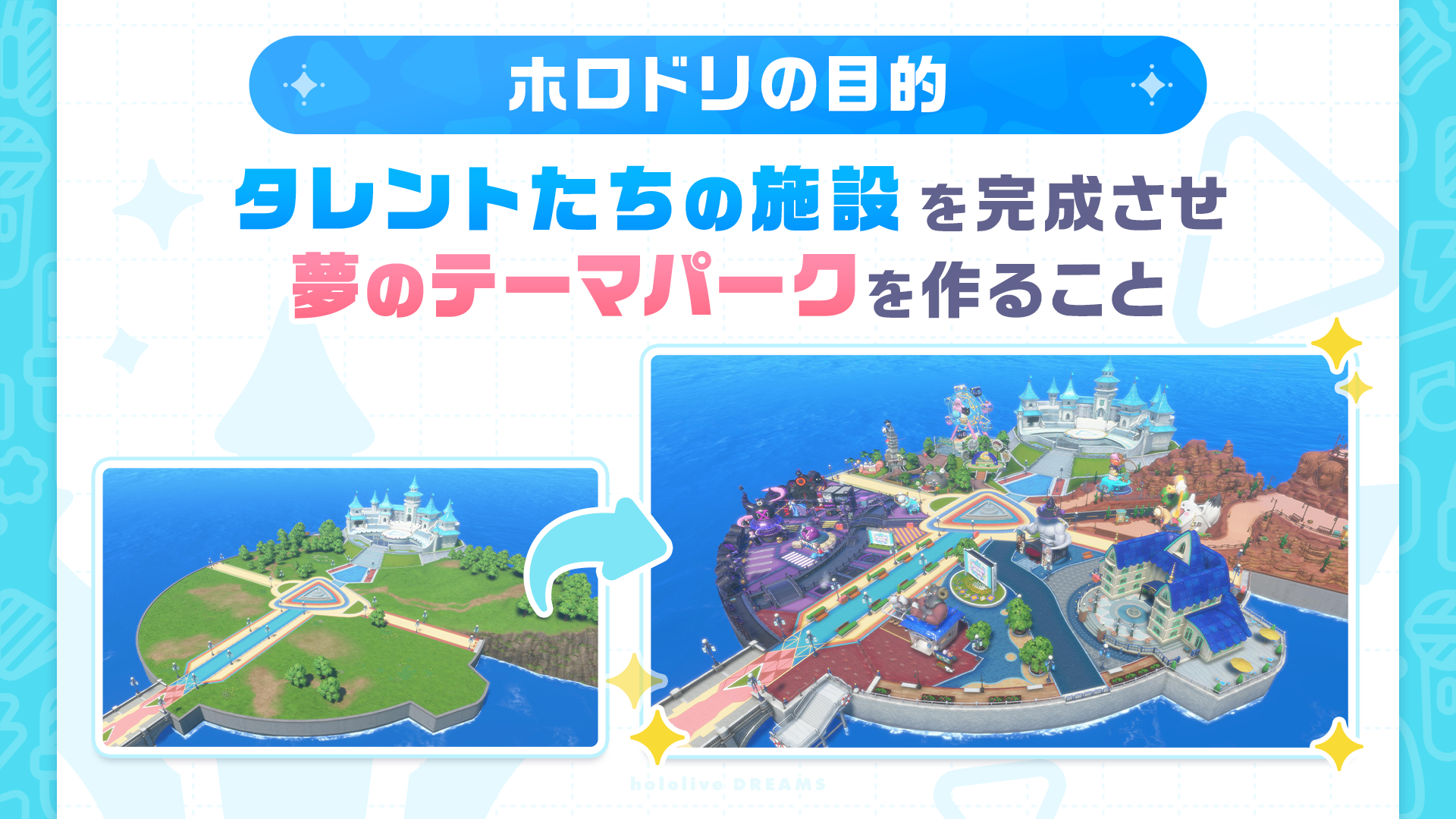 舞台は世界のどこかに浮かぶ無人島。「ホロメン**たちの施設を完成させ、みんなが楽しめる夢のようなテーマパーク「ドリーム・パーク」を作ること」がゲームのゴールとなります。