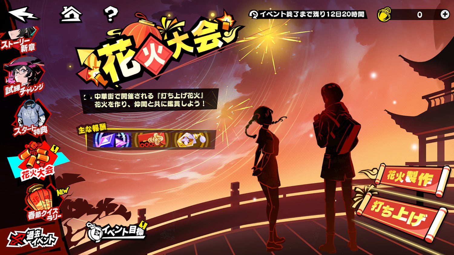 イベント目標のデイリーで獲得した専用アイテム「尺玉」を使って、様々な形の花火を作りましょう! 作成した花火は仲間たちと鑑賞することが可能で、打ち上げた花火の数に応じて「怪盗全書・完成本」、「日彰の宝石」などの育成素材が獲得できます。