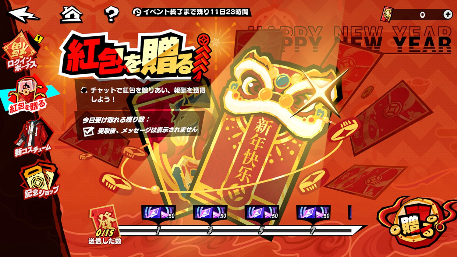 春節イベントで獲得した「紅包」は、ゲーム内チャットにてプレイヤー同士で贈り合うことができ、先着順で一通あたり最大5名まで、ランダムな数の「自在結晶」が手に入ります。「紅包」は一日最大3回受け取れます。また、送信した数に応じてイベント報酬も獲得できるので、手に入れた「紅包」はどんどん贈りましょう!