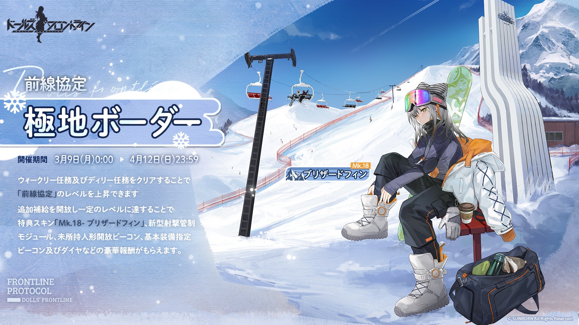 ウィークリー任務とデイリー任務をクリアすることで「前線協定」のレベルが上昇し、新型射撃管制モジュールや未所持人形解放ビーコンなどの豪華報酬がもらえる『前線協定 極地ボーダー』を「3月9日(月)0:00」より開催します。
