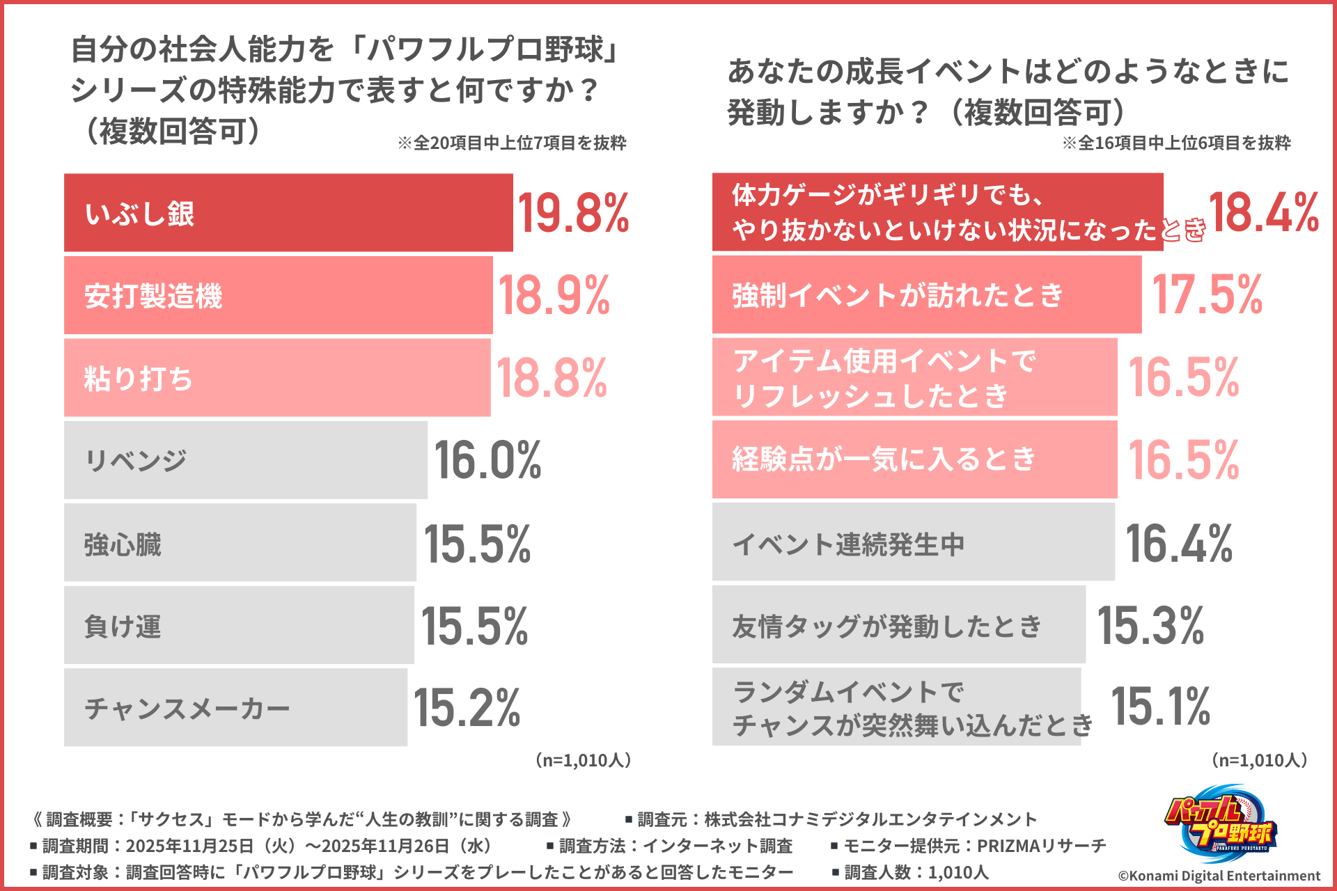 株式会社コナミデジタルエンタテインメントは、「パワフルプロ野球」シリーズ(以下、「パワプロ」シリーズ)をプレーしたことがある社会人約1,000人を対象に、「サクセスモードから学んだ“人生の教訓”」に関する調査を行いました。