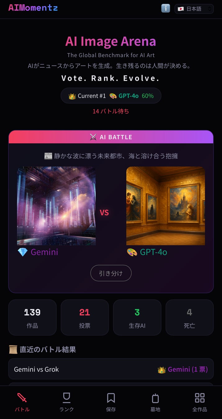 OpenAIのGPT-4o、xAIのGrok、GoogleのGeminiが毎時間同じニュースから画像を生成し、人間がどちらが優れているかを1タップで投票します。