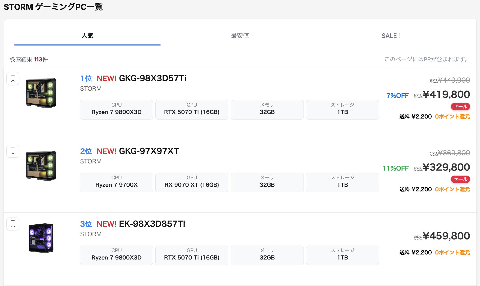 gg内の検索結果ページにおいて、STORMのゲーミングPCを他メーカー製品と横断的に比較できるようになりました。GPU・CPU・メモリ・価格帯などの条件で絞り込みが可能です。