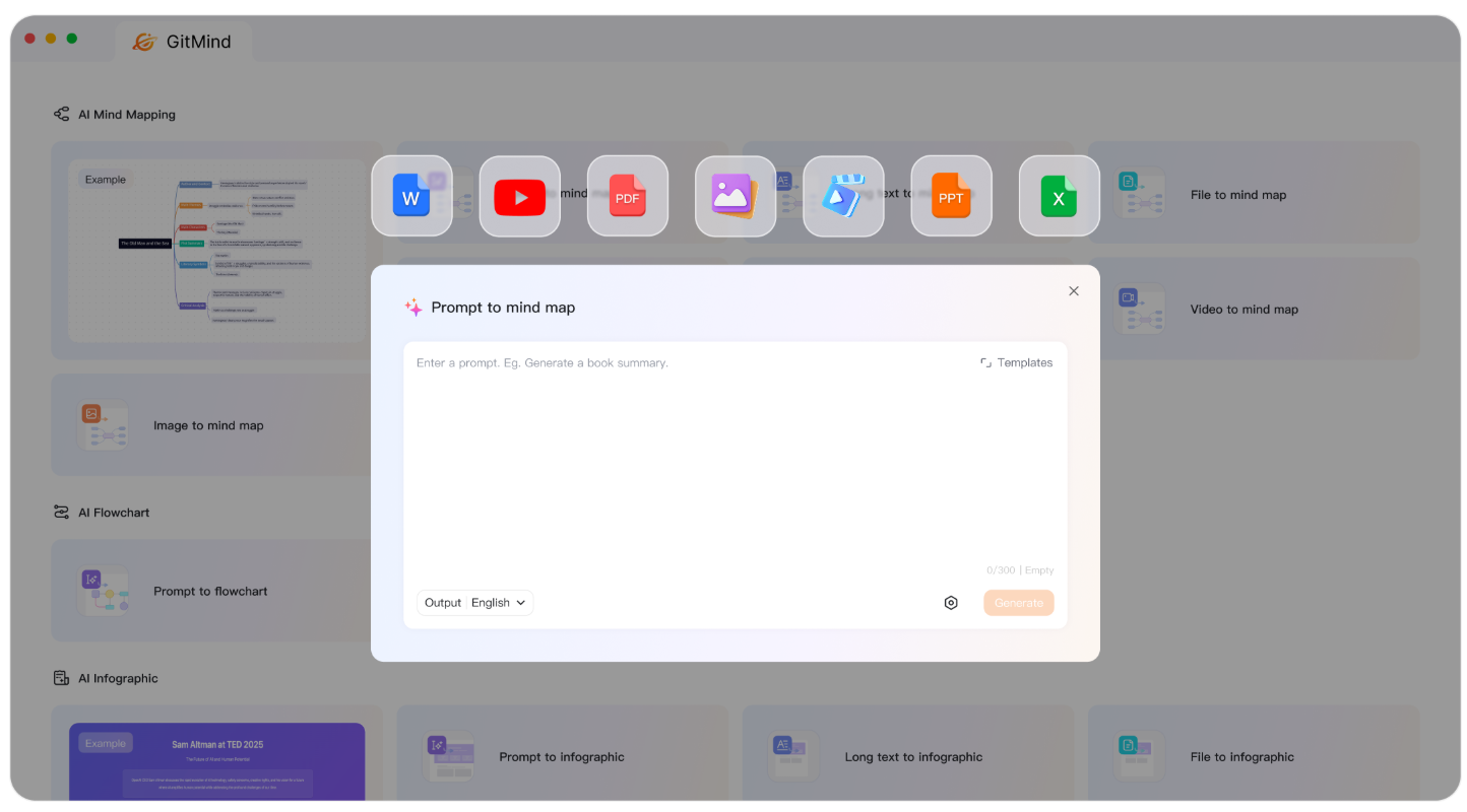 GitMindは、WangxuTech社が提供するクラウドベースのAIマインドマップ・情報整理プラットフォームです。動画・音声・PDF・URLなど多様なインプットから、マインドマップ・フローチャート・インフォグラフィックをAIが自動生成。「インプットして待つだけ」のシンプルな操作で、学習・業務・創造のあらゆるシーンにおける情報処理を革新します。