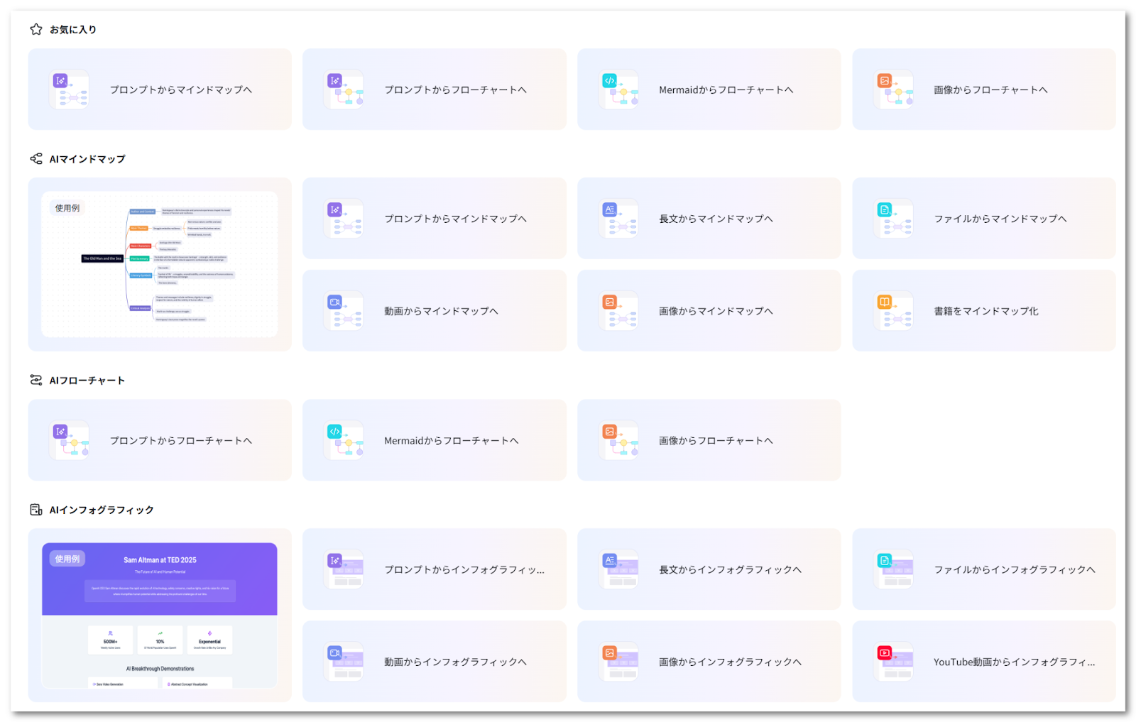 散在していた各AIツールを一覧できる専用ページ「AIツール一覧」を新設。AIマインドマップ・AIフローチャート・AIインフォグラフィック・その他便利ツールの4カテゴリに整理し、用途に合ったツールを素早く発見できる。