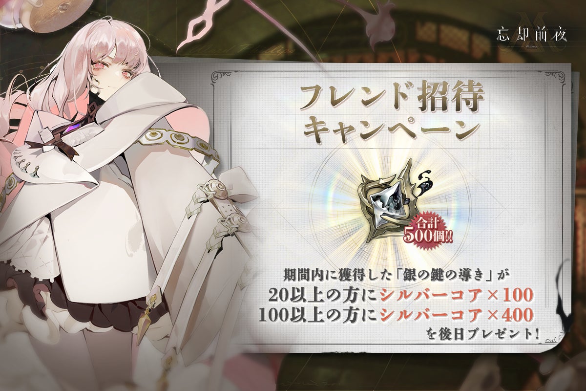 Steam版リリースを記念して、期間中にフレンドを招待することで獲得できる「銀の鍵の輝き」の獲得数に応じて最大で「シルバーコア500個」を後日プレゼント!