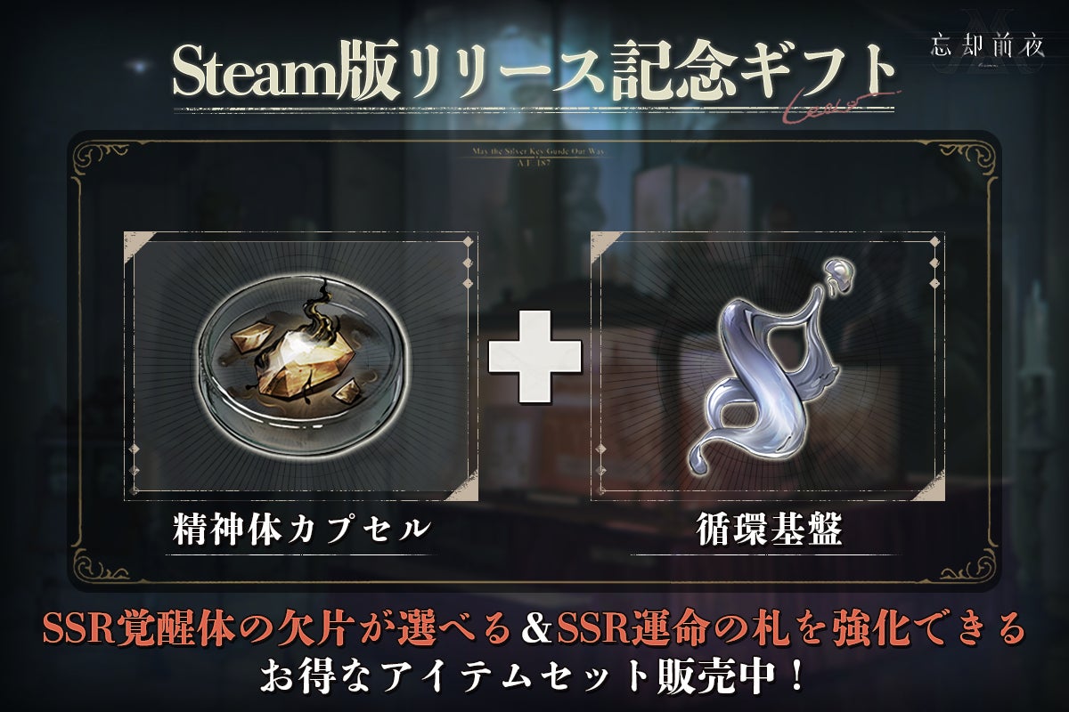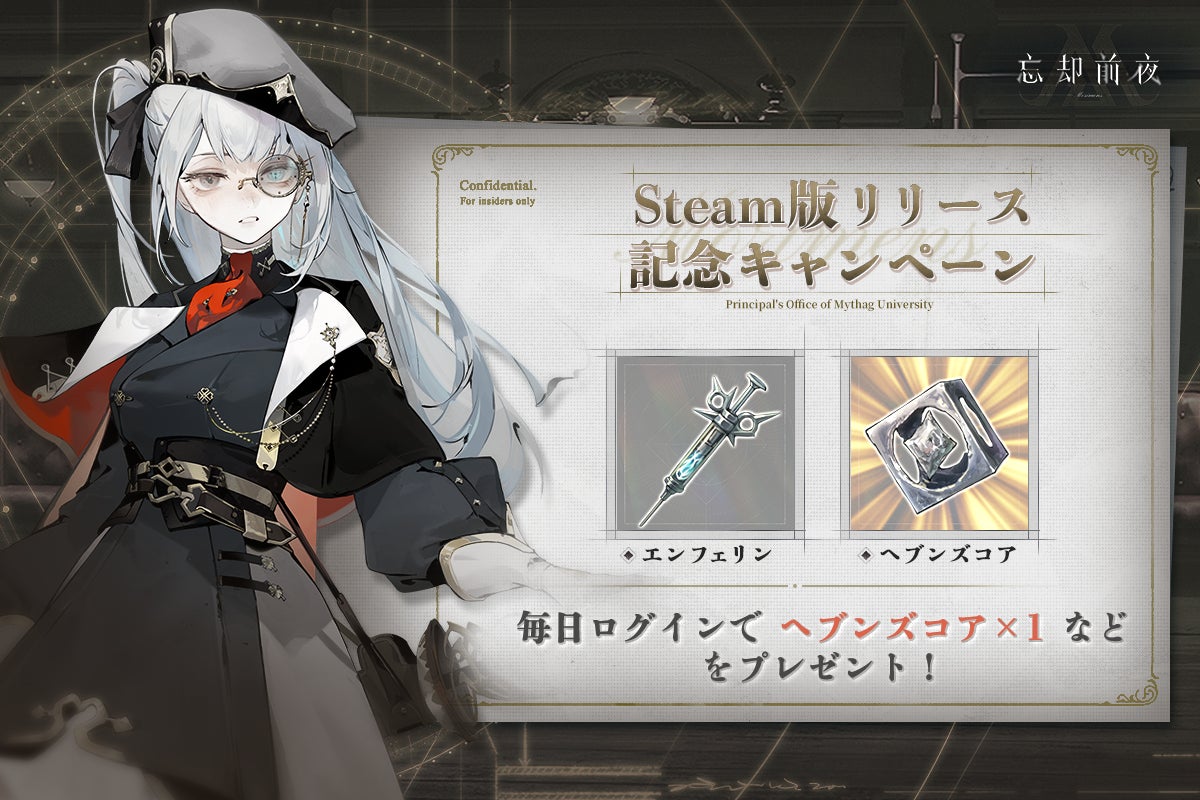 また、Steam版の配信を記念し、本日より「Steam版リリース記念キャンペーン」を実施いたします。守秘者の皆様に向けた特別な報酬を多数用意しておりますので、ぜひこの機会に『忘却前夜』の世界をお楽しみください。