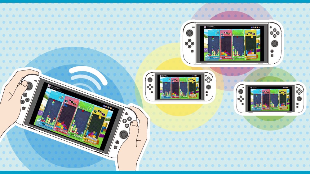 本作では、Nintendo Switch 2 の新機能「おすそわけ通信」を使用し、ソフト1本でゲームをみんなにおすそわけして一緒に遊ぶことができます。また、「ゲームチャット」に参加している人と「おすそわけ通信」をすれば、みんなでおしゃべりしながら「ぷよテト」勝負を楽しめます。本作での「おすそわけ通信」はローカル通信・インターネット通信のどちらにも対応しており、近くの人とも離れた友達ともぷよテト勝負を楽しむことができます。