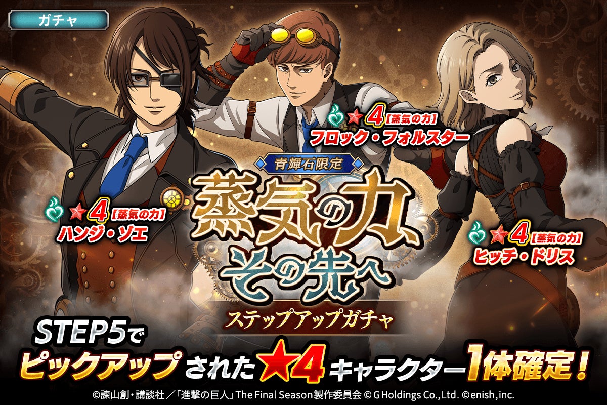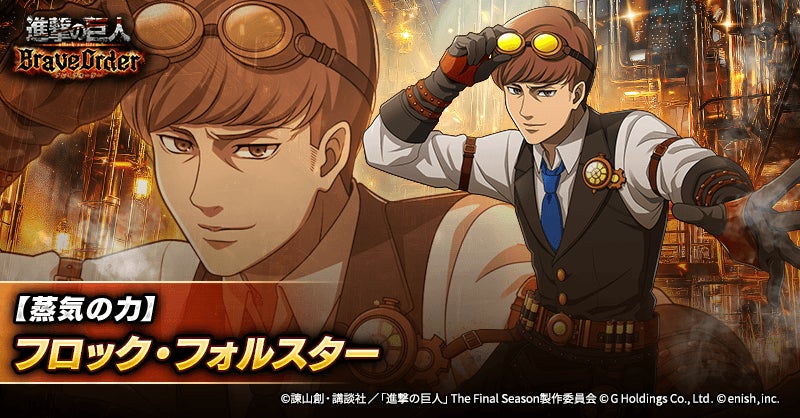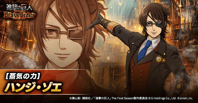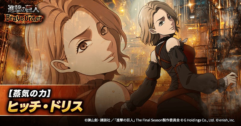 株式会社enish(本社:東京都港区、代表取締役社長:安徳 孝平、以下enish)は、アニメ『進撃の巨人』のスマートフォンゲーム最新作「進撃の巨人Brave Order」にて、2026年3月13日(金)より、新イベントの蒸気の力、その先へを開催!また、本日より【蒸気の力】ハンジ・ゾエ、【蒸気の力】ヒッチ・ドリス、【蒸気の力】フロック・フォルスターが登場する「蒸気の力、その先へガチャ」も開催!その他、最新情報はゲーム公式サイト・ゲーム公式X(旧Twitter)アカウントにて随時公開して行きますので、ぜひご覧ください。