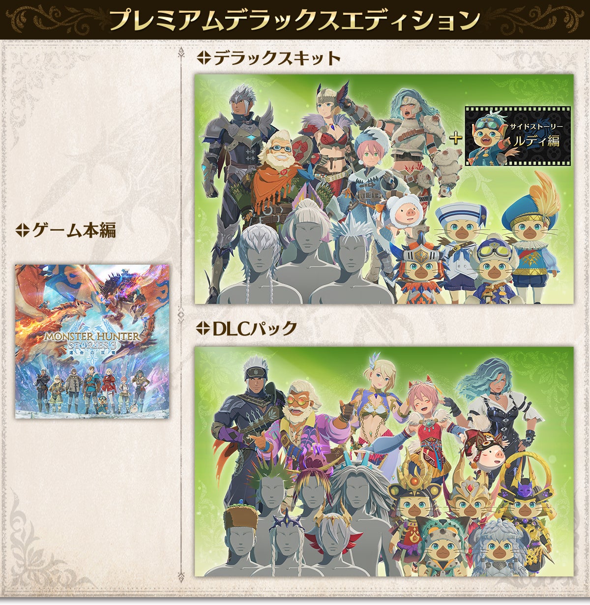 「デラックスキット」のほかに、さらに彩る主人公の髪型、レンジャー衣装、ルディコーデが入った「DLCパック」と、ゲーム本編がセットになったプレミアムデラックスエディション。