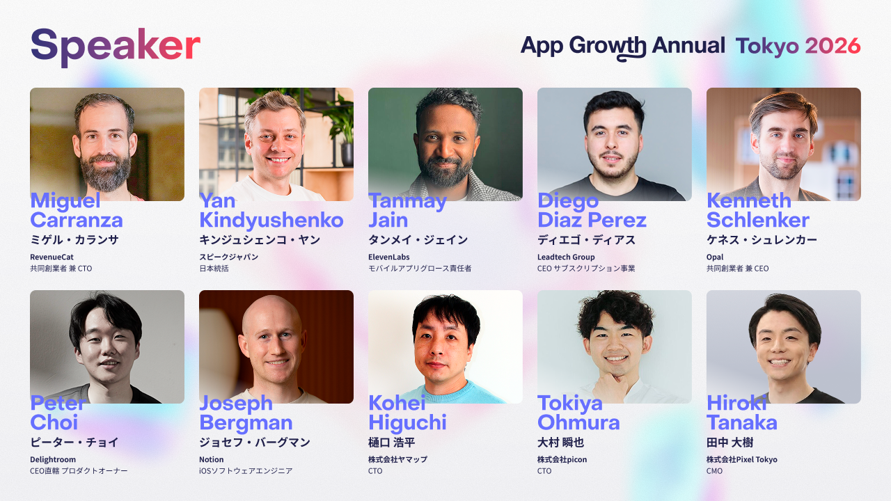 登壇者(敬称略・順不同)Miguel Carranza(RevenueCat 共同創業者 兼 CTO)/Yan Kindyushenko(スピークジャパン 日本統括)/Tanmay Jain(ElevenLabs モバイルアプリグロース責任者)/Diego Diaz Perez(Leadtech Group CEO サブスクリプション事業)/Kenneth Schlenker(Opal 共同創業者 兼 CEO)/Peter Choi(Delightroom CEO直轄 プロダクトオーナー)/Joseph Bergman(Notion iOSソフトウェアエンジニア)Ajay Mehta(Portola 創業者兼プレジデント)/八代 嘉菜(NOT A HOTEL 執行役員CPO)/ホン・ランドン(SmartNews ヴァイス・プレジデント 日本リージョン メディアビジネス担当)/赤川 隼一(株式会社ミラティブ 代表取締役CEO)/ほか