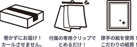1回に5~15枚をご注文いただき、巻かずにお届けいたします。専用クリップ付きで、壁掛けでご利用いただけます。