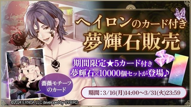 DMM GAMESを運営する合同会社EXNOA(本社:東京都港区、CEO:東條 寛、URL:https://games.dmm.com/)は、Romanteen18シリーズの第1弾・オトナの女性向け恋愛ゲーム「夢幻楼と眠れぬ蝶」にて、新たなゲーム内イベント「先生が全部教えてあげる」を開催したことをお知らせいたします。また、期間限定「★5ヘイロン」カード付き夢輝石セットも販売することをお知らせいたします。