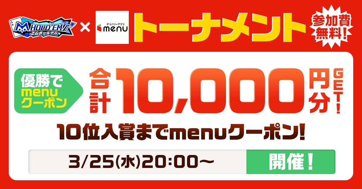 サミー株式会社(本社:東京都品川区 代表取締役 社長執行役員 COO:星野 歩)のスマートフォン向けテキサスホールデムポーカーアプリ「m HOLD’EM(エムホールデム)」は、デリバリーアプリ『menu』の新規登録&初回注文キャンペーンを2026年3月18日(水)から3月31日(火)まで開催いたします。