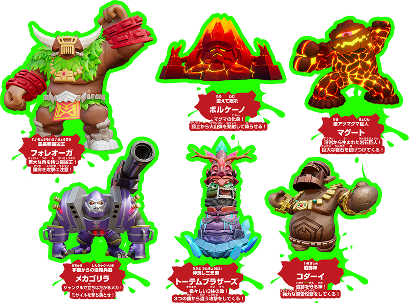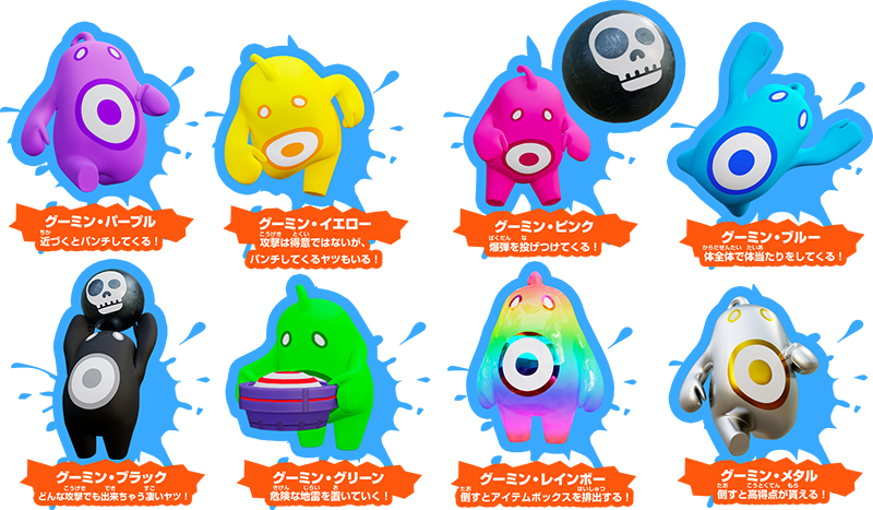 つぎつぎに襲い掛かってくるザコキャラ「グーミンズ」を撃破しながら進んだステージの奥では、凶悪なボスたちが待ち受けています!