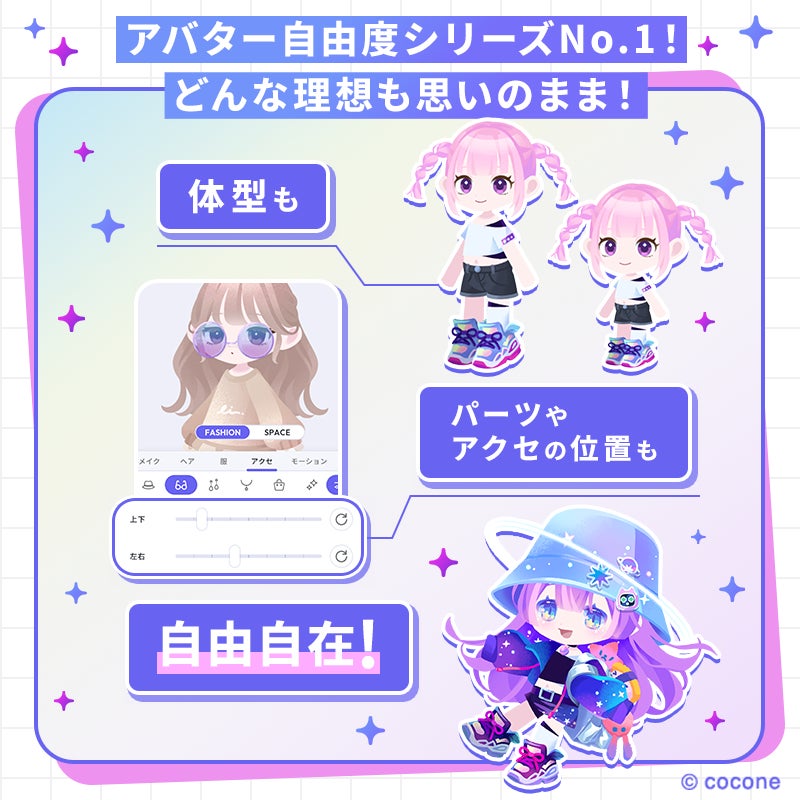 顔や各パーツ、体型だけではなく、一部アクセサリーも配置やサイズを自由に調整でき、高度なカスタマイズ性を実装しています。