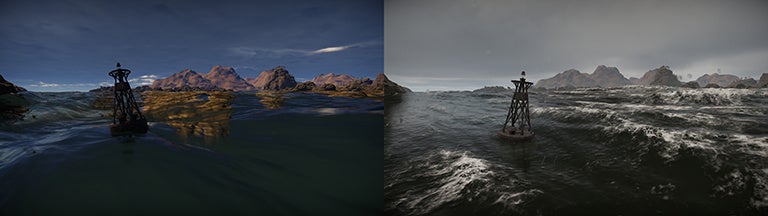 また、透明度とブレンディングのアルゴリズムも作り直しました。透明度とレンダリングモードの新しいロジックも開発され、視点によって反射を歪めていた要素を取り除き、カメラの角度を変えても海面はクリアで物理的に正確な明るさを維持します。