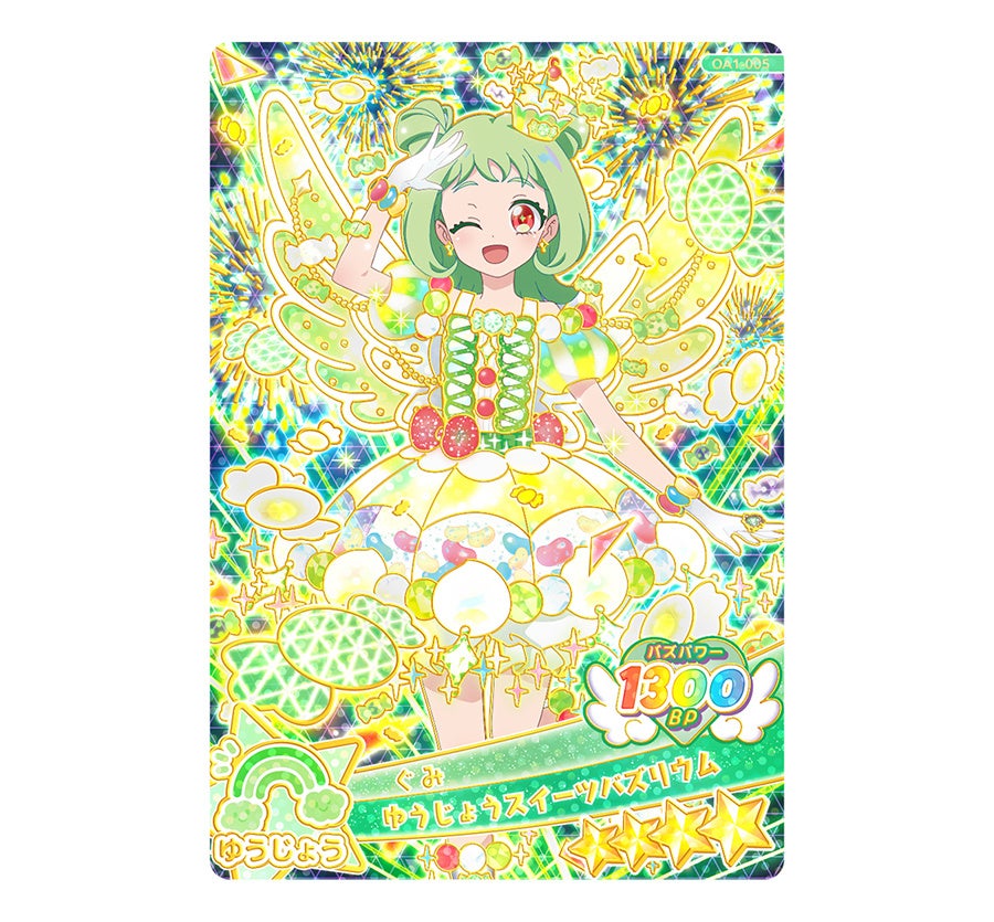 「1だん」では、先に発表した「いのり」「あおい」と共に、新キャラクター「ぐみ」のバズリウムコーデも楽しめるようになります。箔押し仕様のスペシャル感満載のカードになっており、“つばさ”に加えてスイーツをモチーフにしたコーデで、キラキラ輝くライブをプレイすることができます。