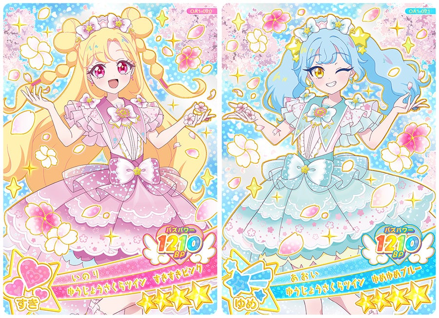 現在上映中の『映画ひみつのアイプリ まんかいバズリウムライブ!』に「いのり」「あおい」がサプライズ出演していることを記念して、劇中に登場する「ゆうじょうさくらツインコーデ」を着た「いのり」と「あおい」のアイプリカードが「1だん」にラインアップされます。映画のキーコーデにもなっている「ゆうじょうさくらツインコーデ」は、『ひみつのアイプリ』から『おねがいアイプリ』にバトンタッチする“アイプリ”にとっても特別なコーデとなっています。
