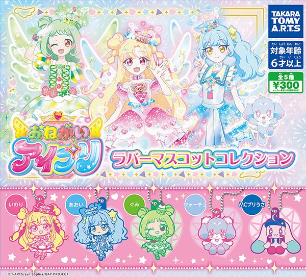 『おねがいアイプリ』のアニメ・アミューズメントゲームのスタートに合わせて、ガチャ® (カプセルトイ)から『おねがいアイプリ ラバーマスコットコレクション』<希望小売価格1回300円/税込>が登場します。4月より全国のカプセル自販機(ガチャマシン)で発売されます。