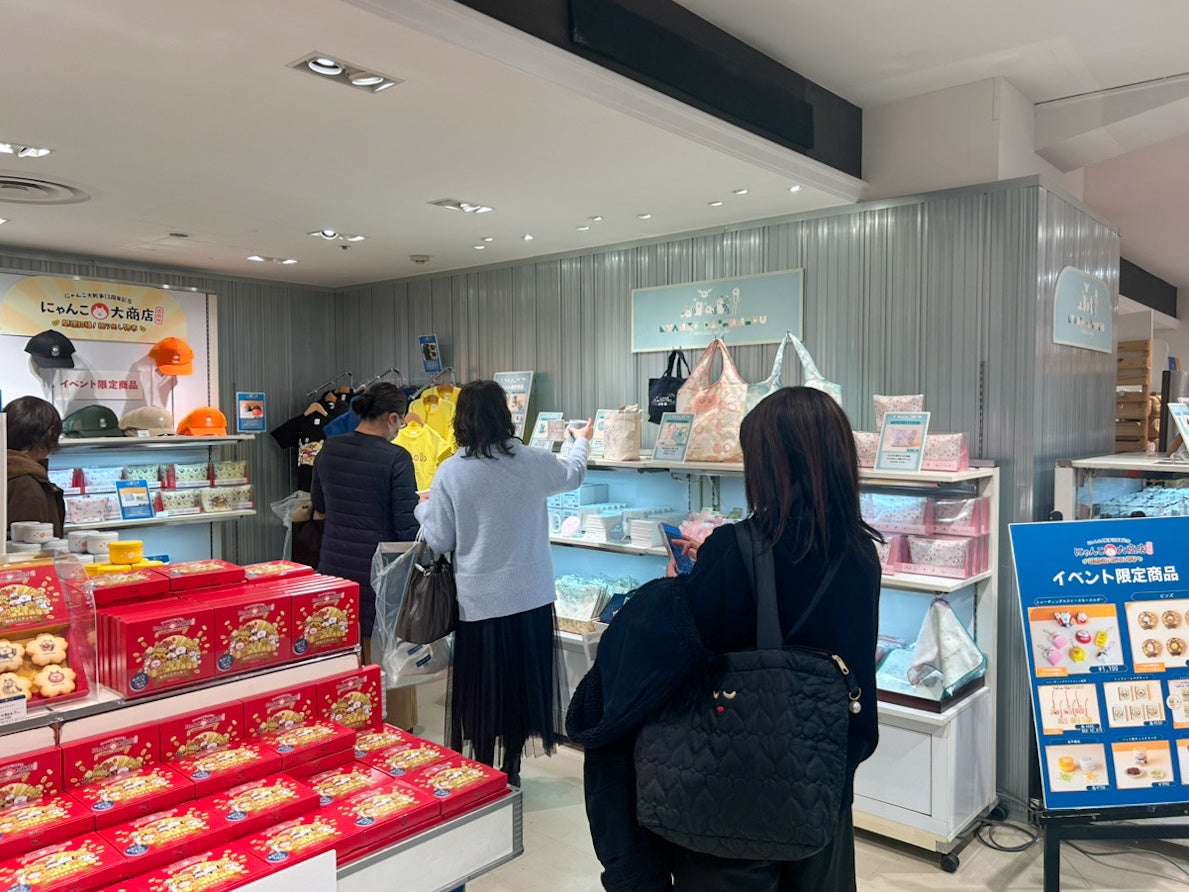 新作グッズをはじめ、ぬいぐるみや雑貨など約600点の「にゃんこ」グッズが並び、来場者が商品を手に取りながらお買い物を楽しむ様子が見られました。