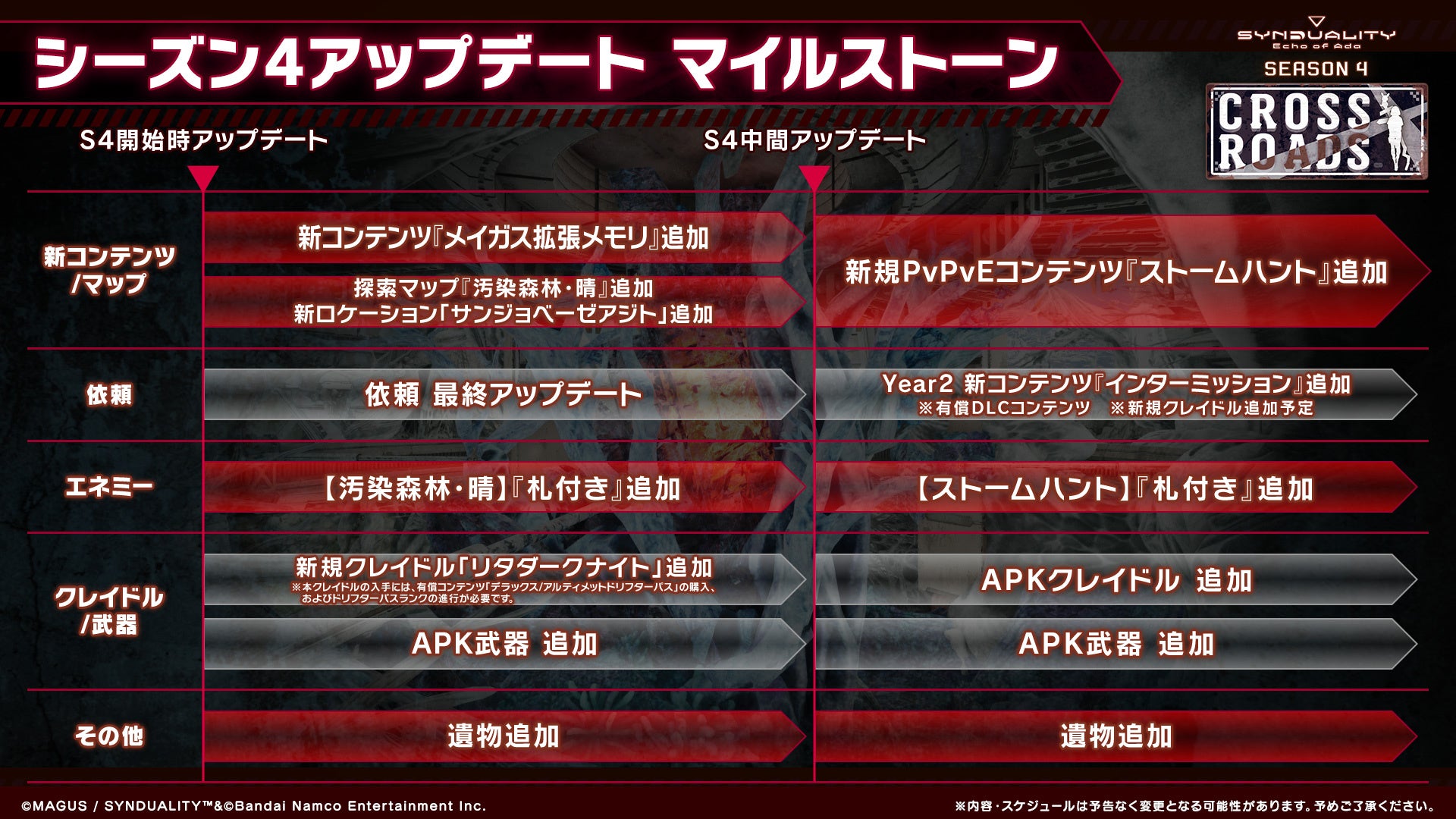 株式会社バンダイナムコエンターテインメントは、PlayStation®5/Xbox Series X|S/STEAM®『SYNDUALITY Echo of Ada』に関して、日本時間2026年3月19日(木)より、最新シーズンSEASON4「CROSS ROADS(クロスロード)」の配信を開始したことをお知らせいたします。SEASON4「CROSS ROADS」では、新たな探索マップ「汚染森林・晴」および新規ロケーション「サンジョベーゼアジト」を追加したほか、メイガスの新たな強化要素「メイガス拡張メモリ」が登場。物語がひとつの区切りを迎え、本作が新たな局面へ進む節目のシーズンとして、今後の展開につながる各種機能・コンテンツを実装しております。