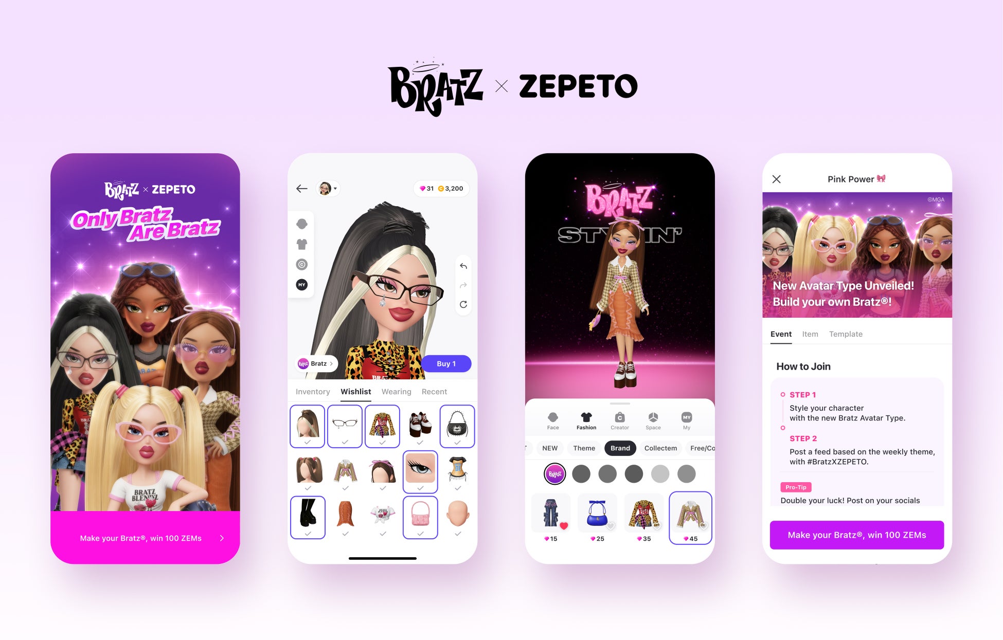 ユーザーはZEPETOアプリ内でBratzアバターを選択し、各テーマに沿ってスタイリングを行うことで参加できます。