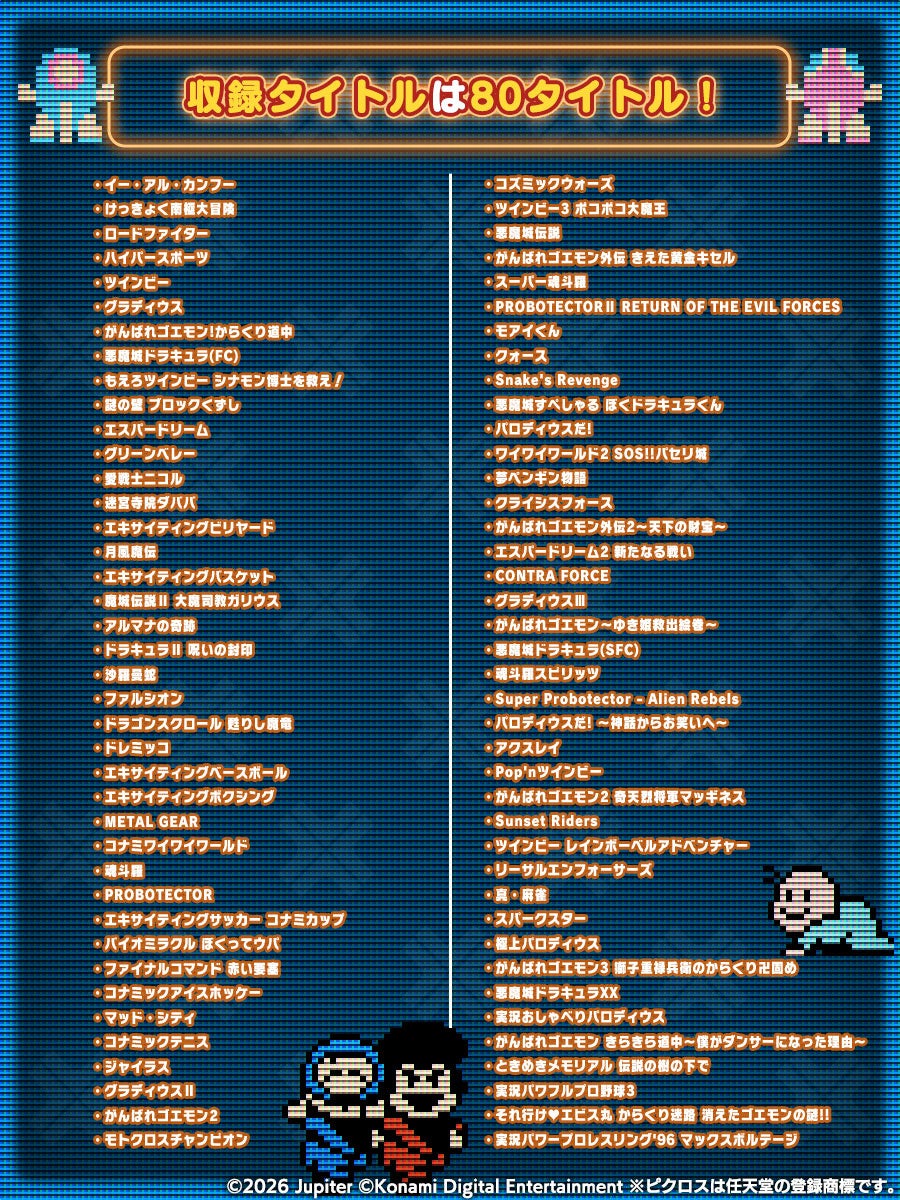 長年愛されている「悪魔城ドラキュラ(Castlevania)」シリーズや「魂斗羅」シリーズ、「グラディウス」シリーズをはじめ、スポーツや恋愛シミュレーションなど多彩なジャンルのゲームキャラクターがドット絵パズルになりました。