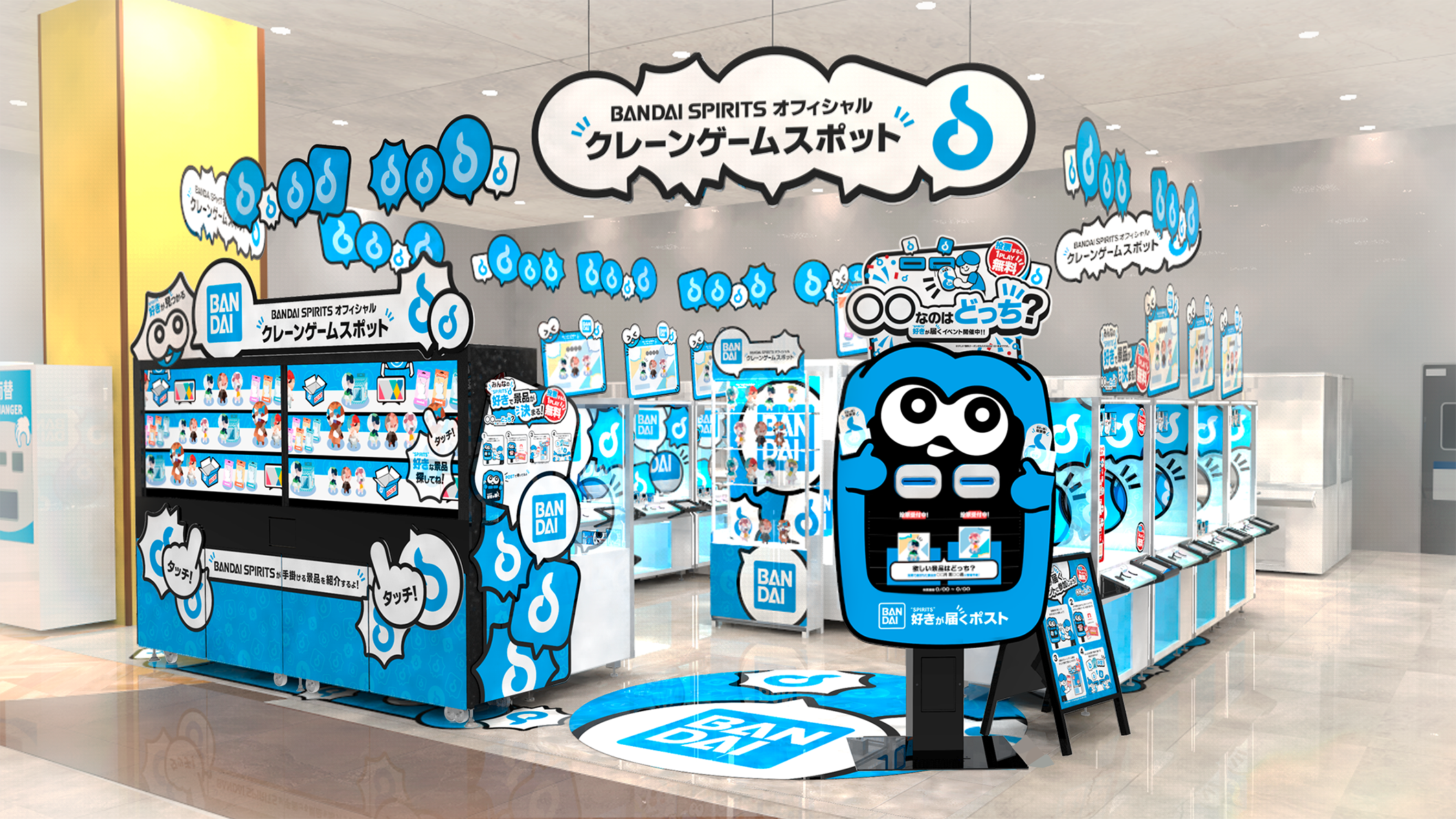 『BANDAI SPIRITS オフィシャルクレーンゲームスポット』は、「好きが見つかる、好きが届く」をコンセプトに、BANDAI SPIRITSで製造した幅広い作品の景品を取り扱うクレーンゲームスポットです。