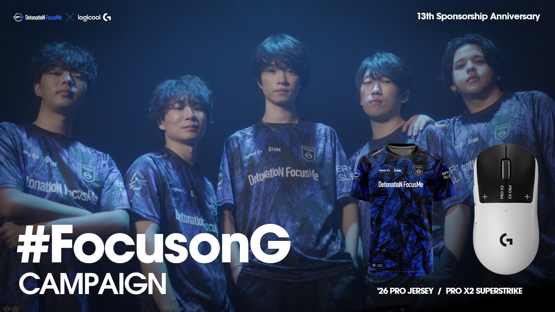 ロジクールG公式Xアカウント(@LogicoolG)とDFMの公式Xアカウント(@team_detonation)をフォローし、公式Xアカウントに投稿予定の指定のキャンペーン投稿をリポストした方の中から抽選で1名様に、ロジクールGのゲーミングマウス「PRO X2 SUPERSTRIKE」と、DFMの公式ユニフォームをセットでプレゼントいたします。