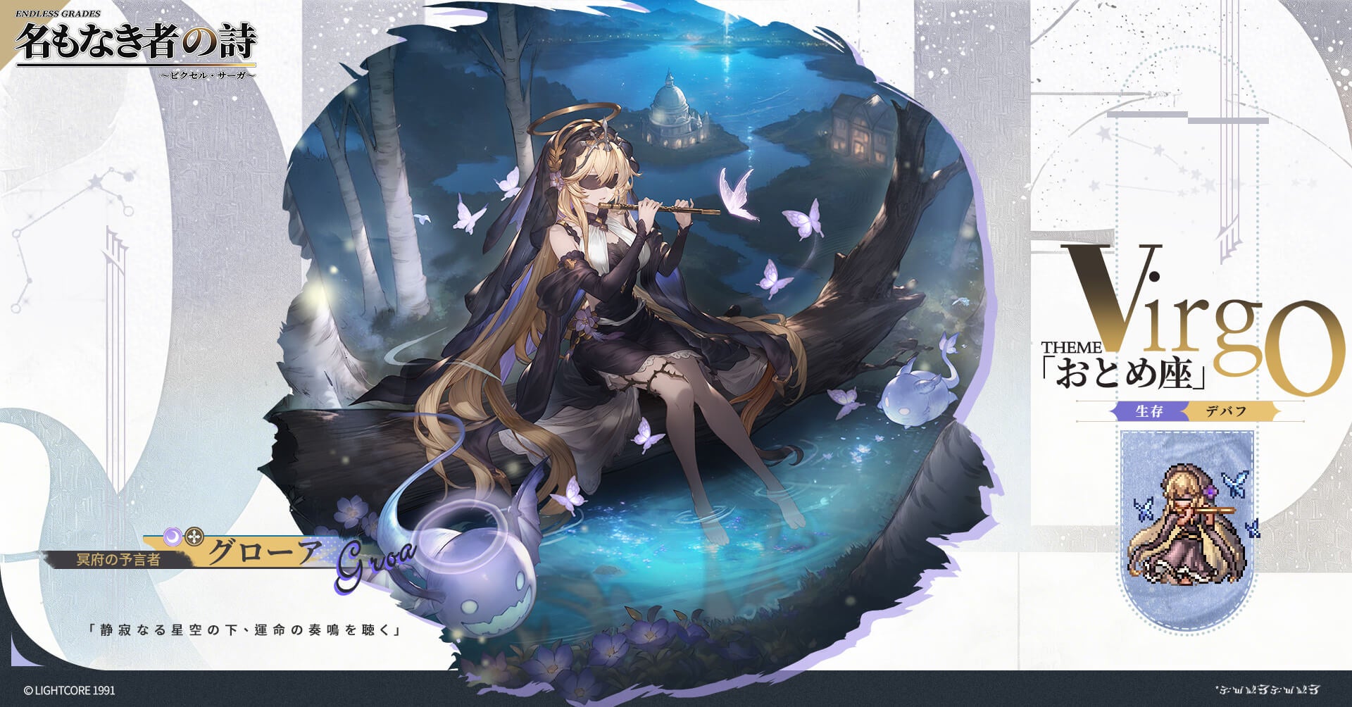 イベント期間中にグローアをランク15まで昇格させることで獲得できる限定コスチューム「おとめ座」。漆黒のドレスを纏い、聖域の森で星々を導く指揮者のように骨笛を奏でる、グローアの神秘的な一面を解放しましょう。