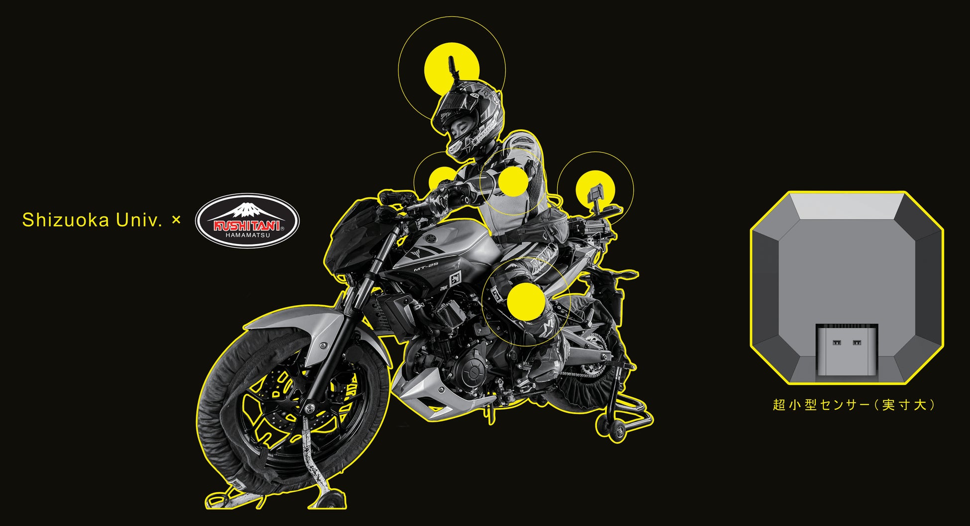 静岡大学との共同研究では、モーターサイクルとライダーの動きの両方を取得するため、車体側(GNSS/IMU)と、ライダー側(レザースーツへのIMU等)の同時計測を実走環境で検証してきました。 しかし従来の方式では、スーツ内を有線でCPUへ接続する必要があり、取り回しが難しく、汎用性(誰でも使える形)に課題がありました。 そこで本プロジェクトでは、IMUの無線化に取り組み、モーターサイクル特有の高ノイズ環境でも安定動作することを目指します。さらに、両膝・両肘・ヘルメットなどに取り付け可能な、Apple AirTag級(約15mmクラス)の超小型センサーでライダーの動きを取得する構想を進めています。 将来的には、この小型センサーをレザースーツ内に“パーツとして組み込む”ことで、誰もが走行中の状態を可視化できる仕組みへ――KUSHITANIと共に、実験から製品化までを見据えて開発を進めていきます。