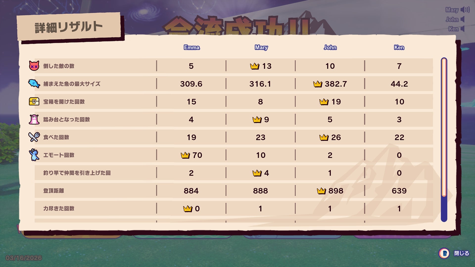 「エニグマ諸島」は毎日地形が変化するため、挑戦するたびに異なる登山体験が楽しめます。リザルトでは各項目で最も貢献したプレイヤーに王冠を授与。さらに、特定条件を達成すると限定ステッカーを獲得できます。コンプリートを目指しましょう!